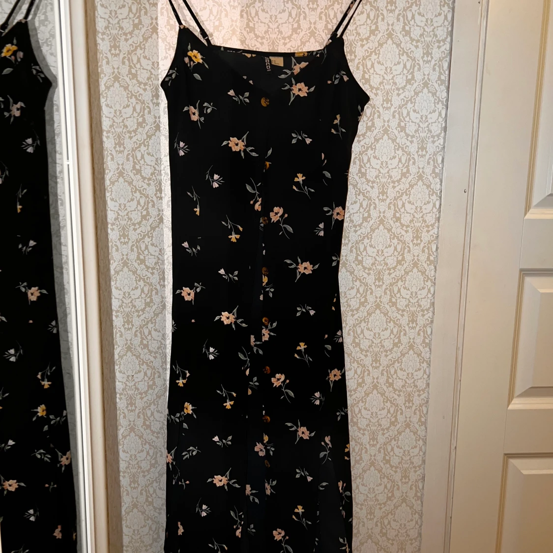 Denna klänning är med knappar och är i storlek M, den har en öppning mitt i fram.