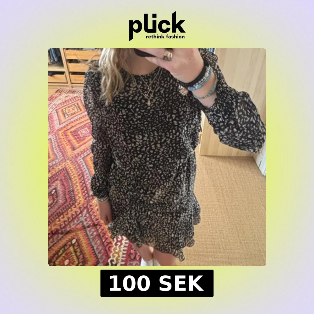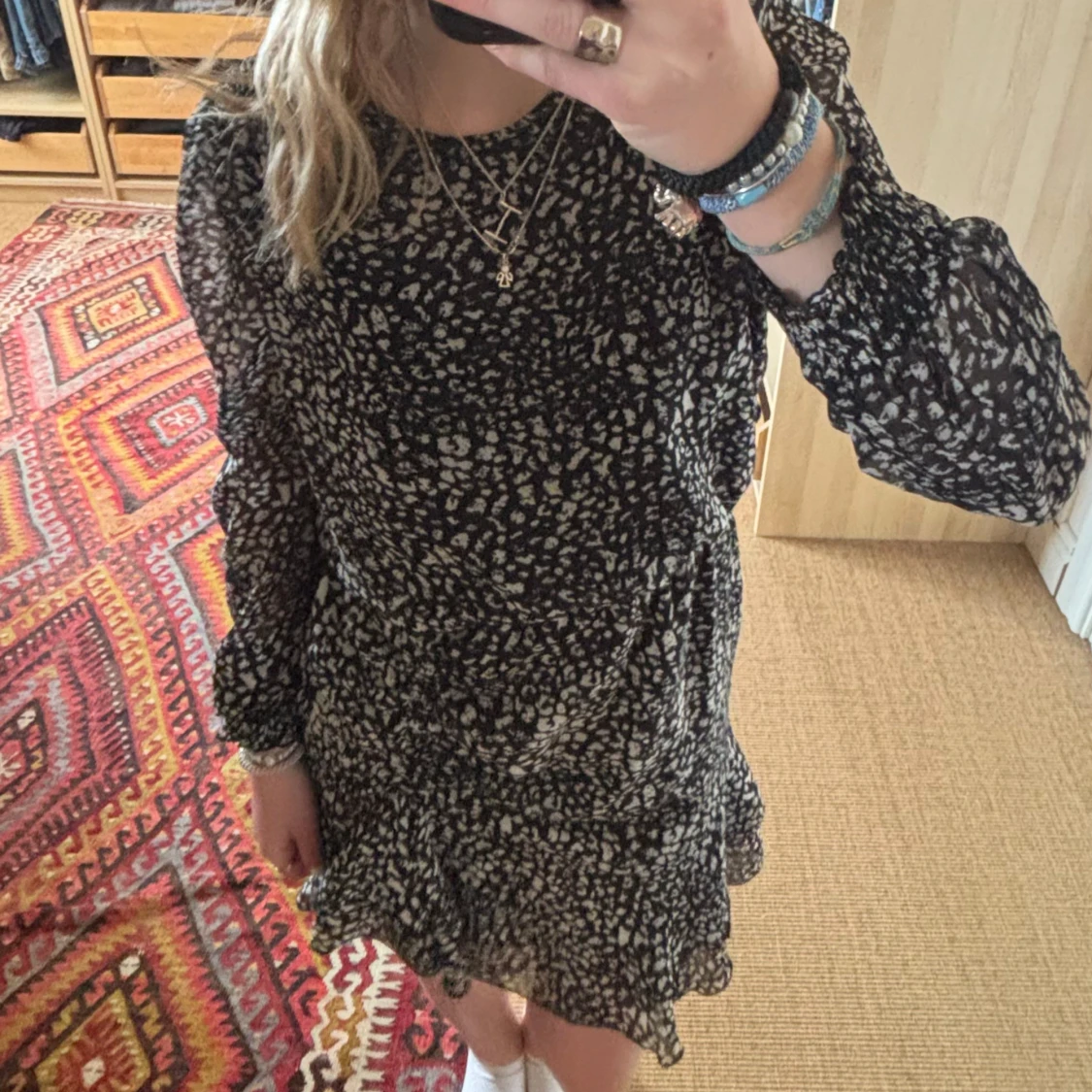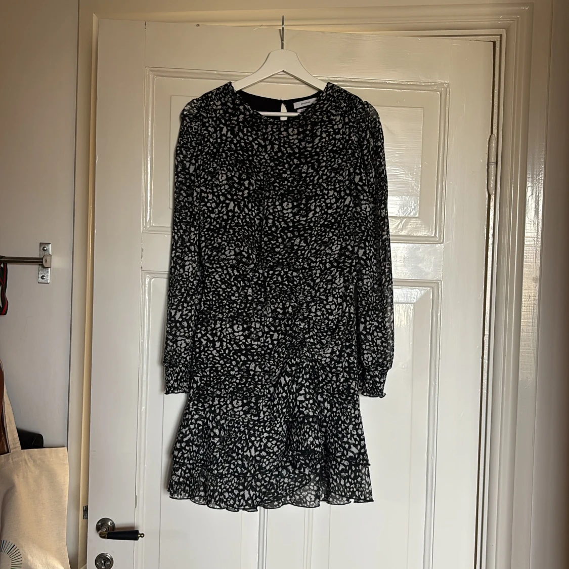 Säljer en snygg svart och vit mönstrad klänning med volangdetaljer. Klänningen har långa ärmar och en kort längd. Den är använd få gånger och är i mycket bra skick.