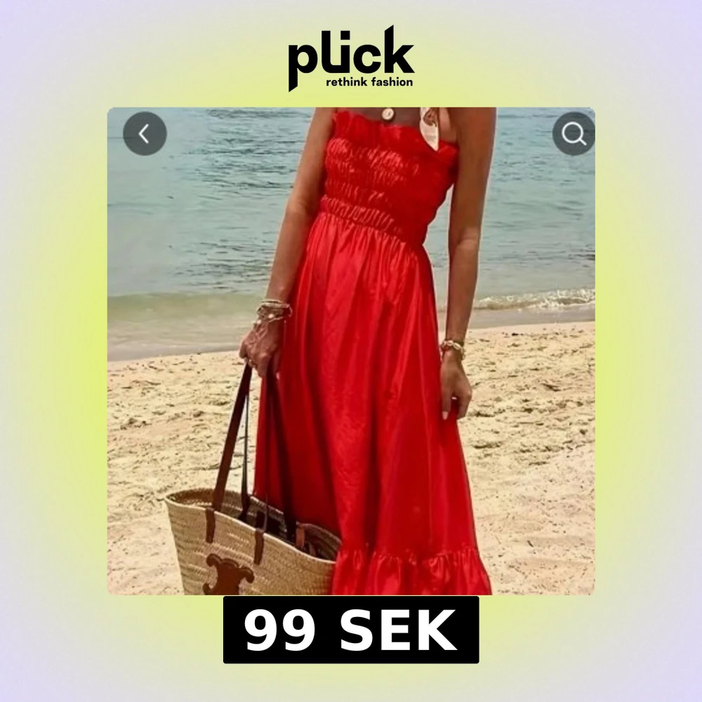 Snygg röd axelbandslös klänning med smockdetaljer upptill och volang nedtill. Perfekt för sommarens varma dagar. Klänningen har en luftig passform och är lätt att bära.