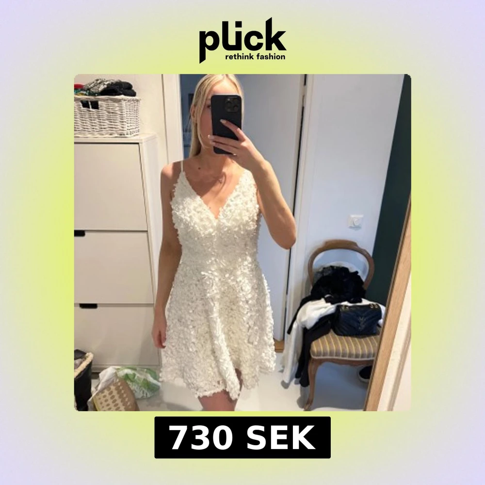 Säljer en superfin vit klänning med blommigt mönster och smala axelband. Klänningen har en v-ringad design och är perfekt för studenten och sommaren.. Den är kort och har en dragkedja i ryggen för enkel påklädning. Har använt den 1 gång på min egna student så den är i nyskick! Nypris var cirka 1500kr