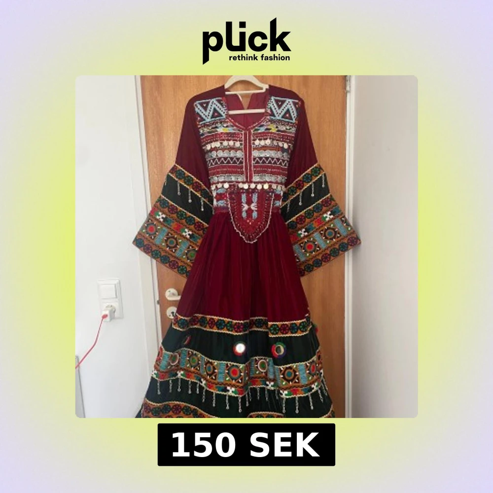 Unik vafgansk långklänning i sammet med breda ärmar, färgglada broderier, små speglar och silverdetaljer. Klänningen har v-ringning, knytning i ryggen och coola mönster i blått, grönt, gult och orange. Perfekt för dig som vill sticka ut med traditionell och färgstark stil.