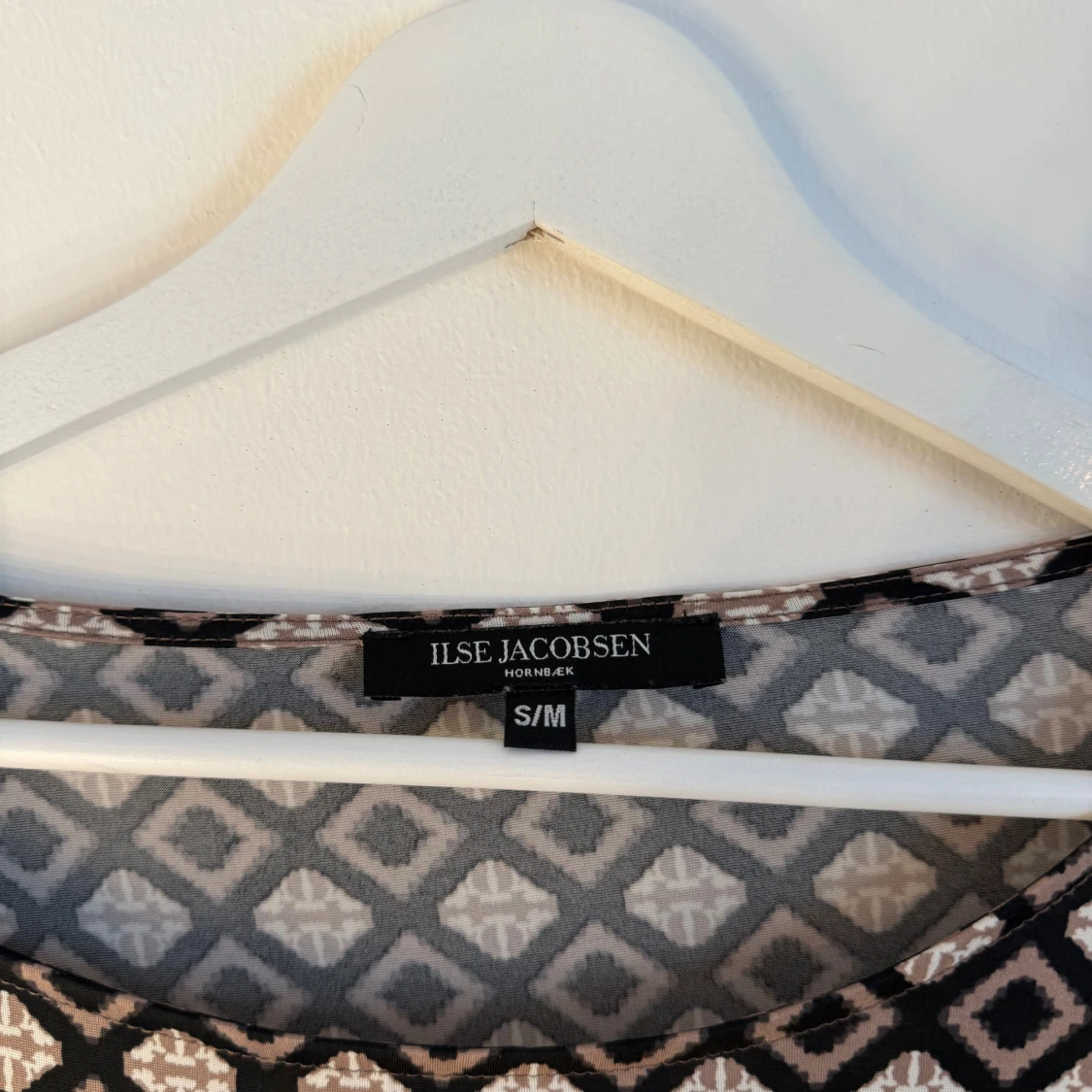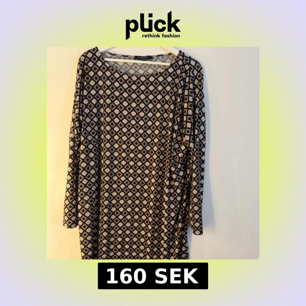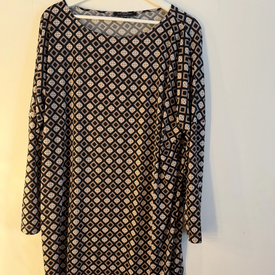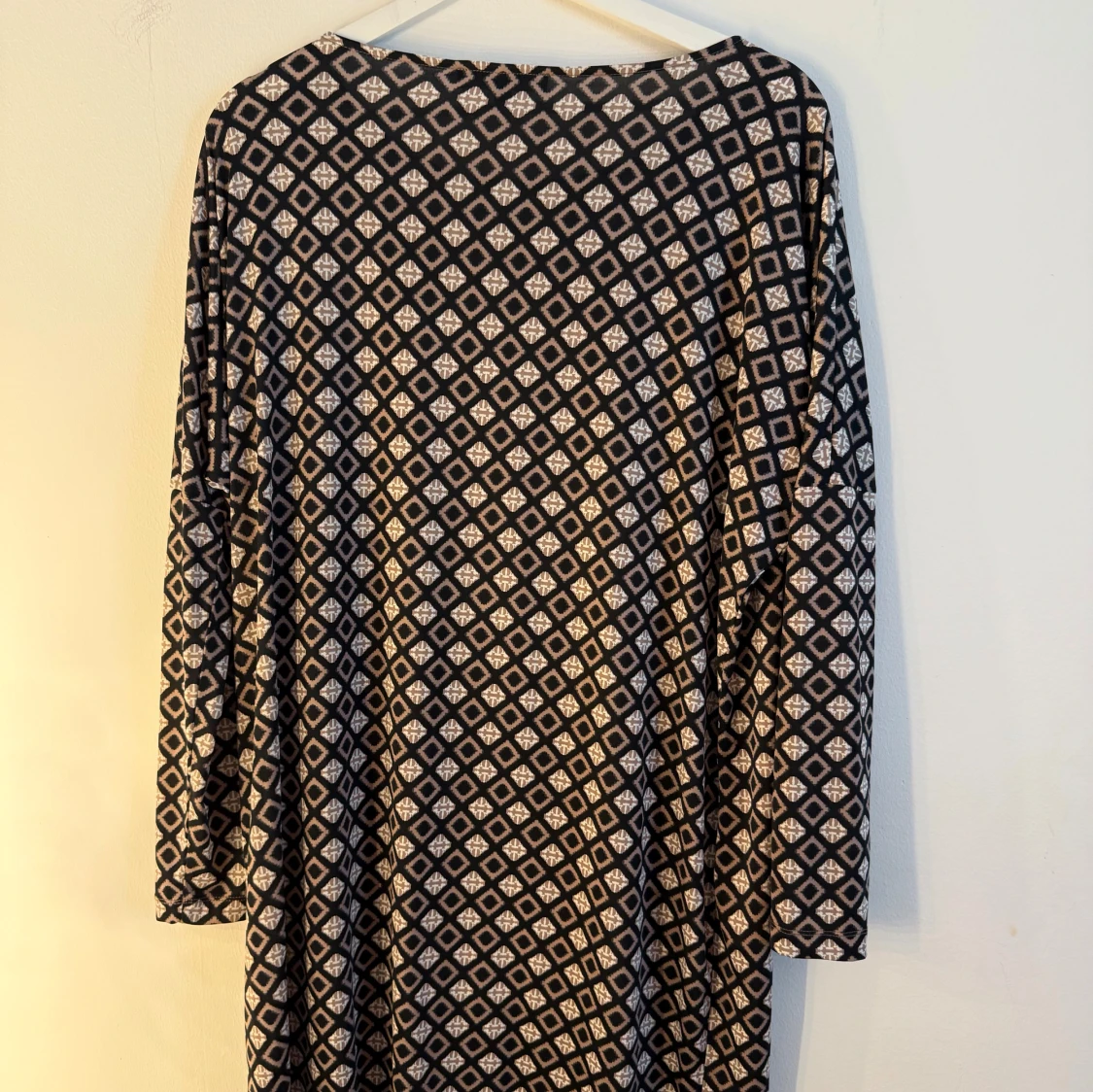 Svart klänning med ett geometriskt mönster i beige och vitt. Klänningen har långa ärmar och en rund halsringning. Den har en rak passform. Storlek S/M men mer en M