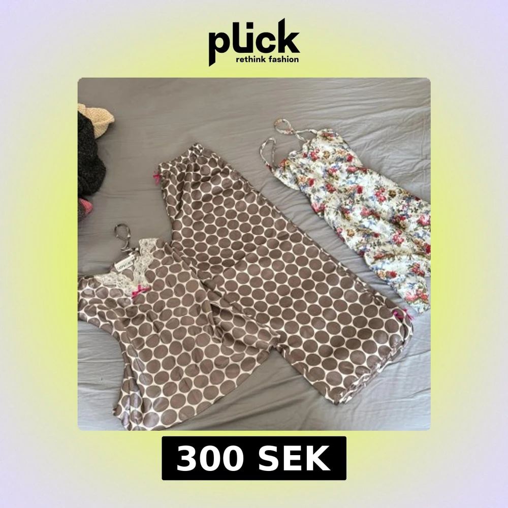 Säljer en somrig blommig klänning/nattlinne med smala axelband och en prickig pyjamas från Cappuccini. Klänningen har ett färgglatt blommönster medan pyjamasen är brun med stora vita prickar och spetsdetaljer vid halsen.