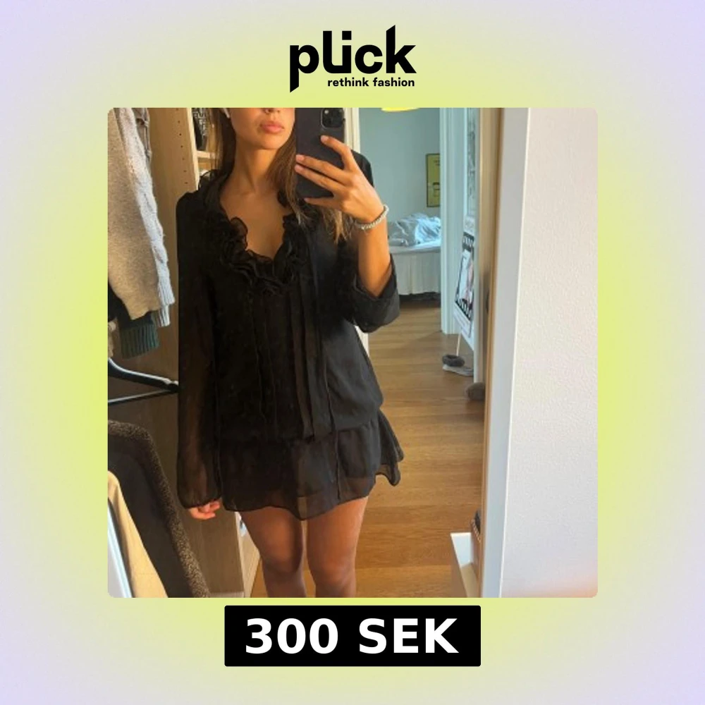 Säljer en svart kort klänning med volangdetaljer vid halsringningen och nederkanten från Saint Tropez. Klänningen har långärmade transparenta ärmar och ett flowy, lätt material som ger en snygg och luftig look. Perfekt för dig som gillar romantiska detaljer och en chic stil.