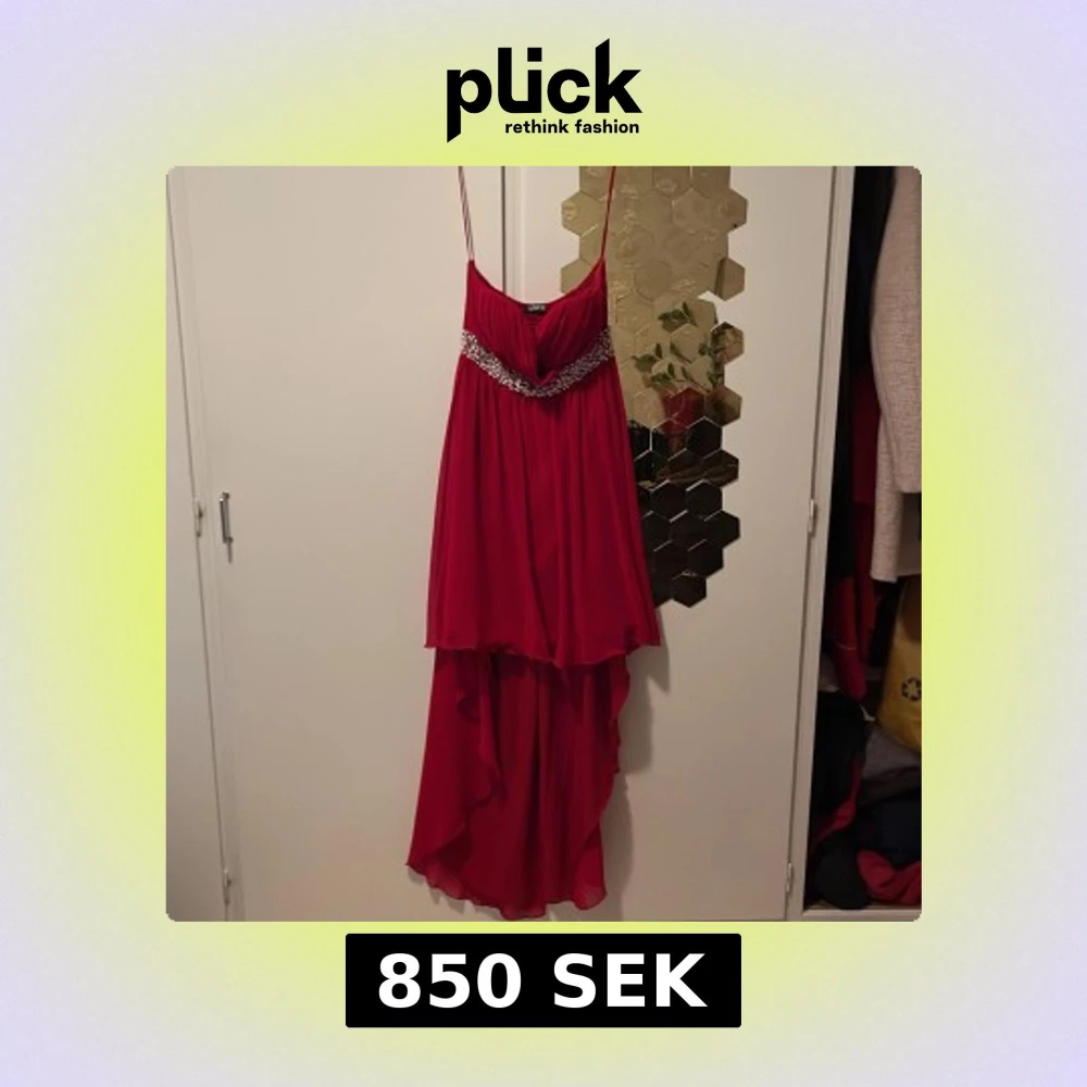 Säljer en röd långklänning från WISCO med tunna axelband och vacker pärldekor under bysten. Klänningen har ett flowigt lager på lager-utseende och asymmetrisk nederkant. Perfekt för dig som vill sticka ut med en elegant och färgstark look.