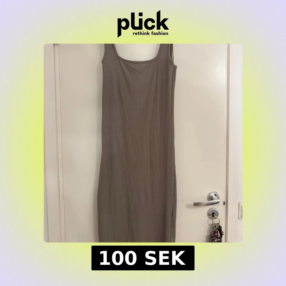 Säljer en beige ribbad långklänning med ärmlös design och fyrkantig ringning. Klänningen har en tight passform och är tillverkad i mjuk bomullsmix som känns skön mot huden. Perfekt för dig som gillar stilrena och enkla plagg med en modern touch.