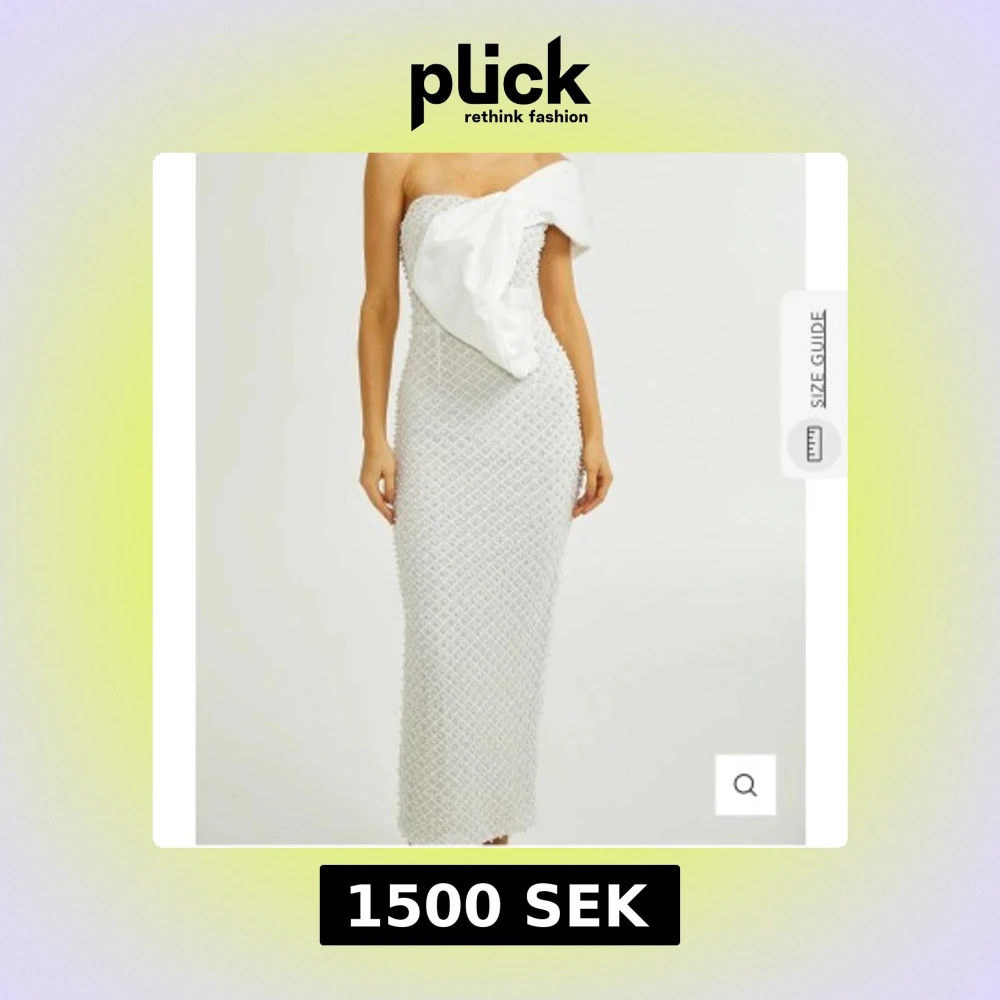 Superfin vit axelbandslös långklänning med en stor rosett framtill och pärlbroderier över hela klänningen. Köpt från miss rosier för 2300 kronor. Alla pärlor sitter på plats. Säljer för 1500 men pris kan diskuteras vid snabbt köp. Storlek M.