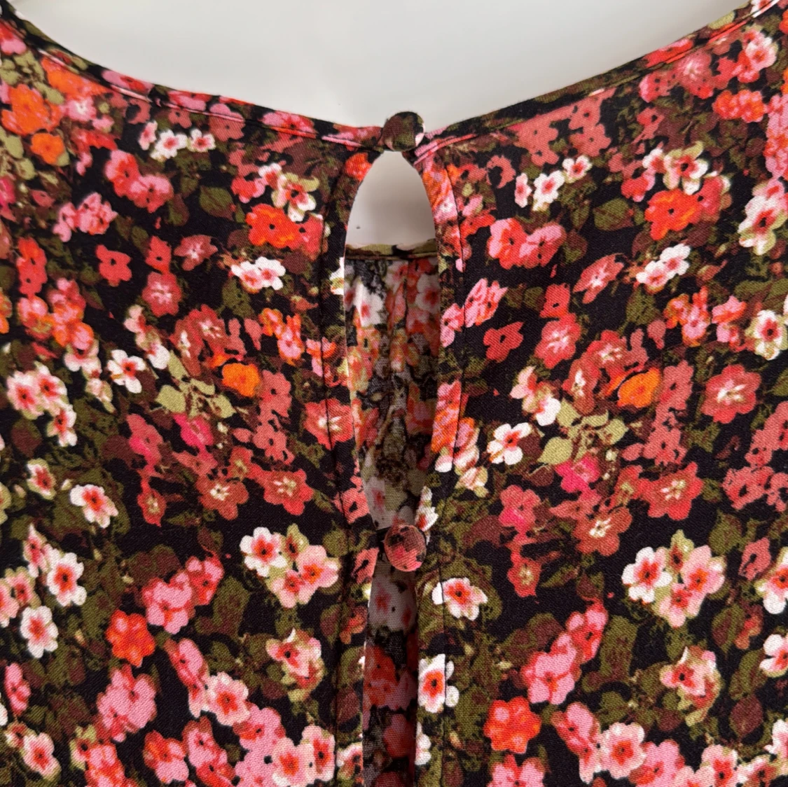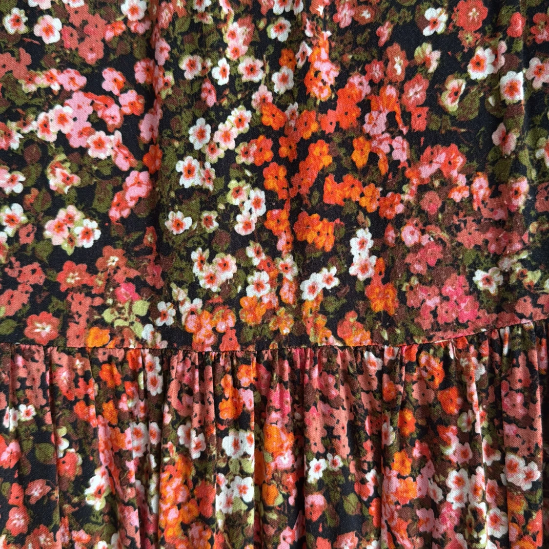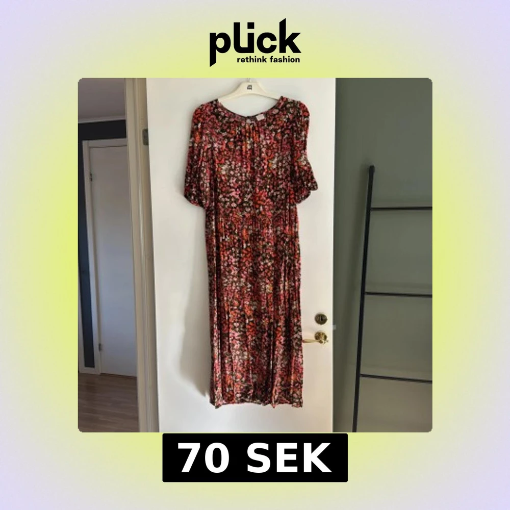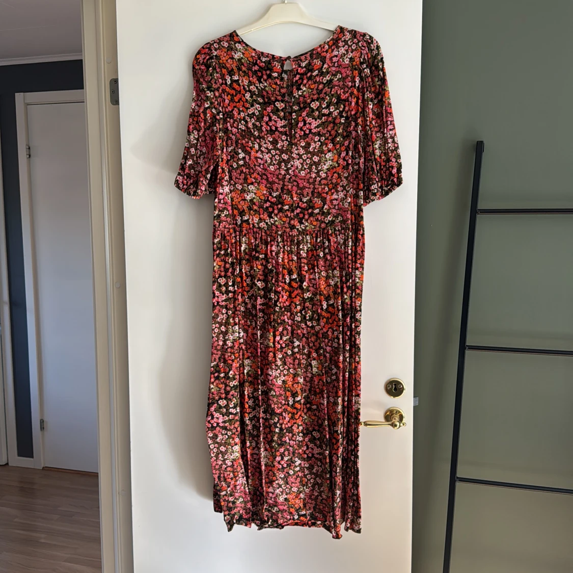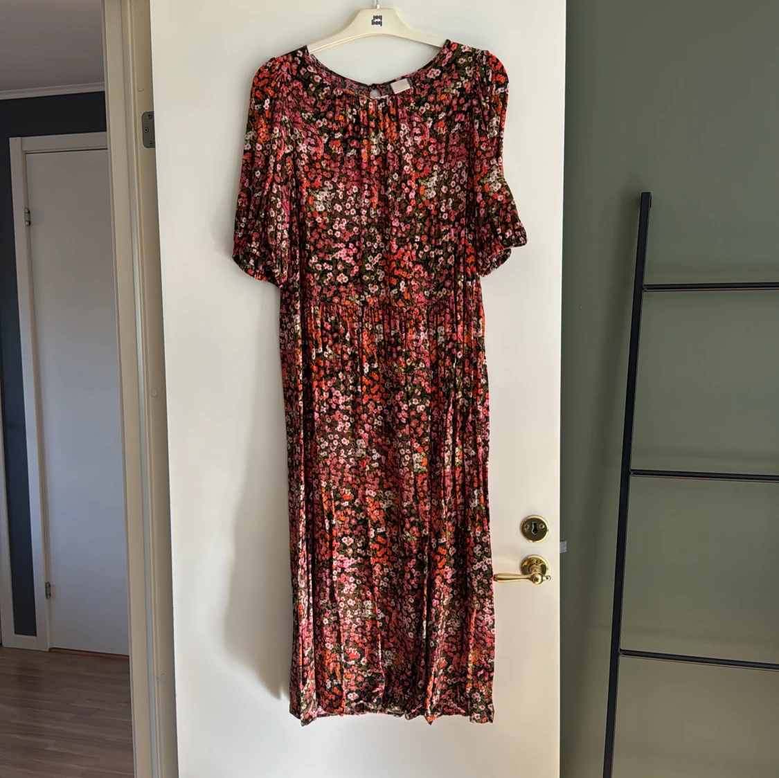 Säljer en långklänning med färgstarkt blommönster i rött, rosa, vitt och grönt på svart botten. Klänningen har korta ärmar, rund halsringning och knäppning bak i nacken. Perfekt för dig som gillar romantiska och färgglada plagg.