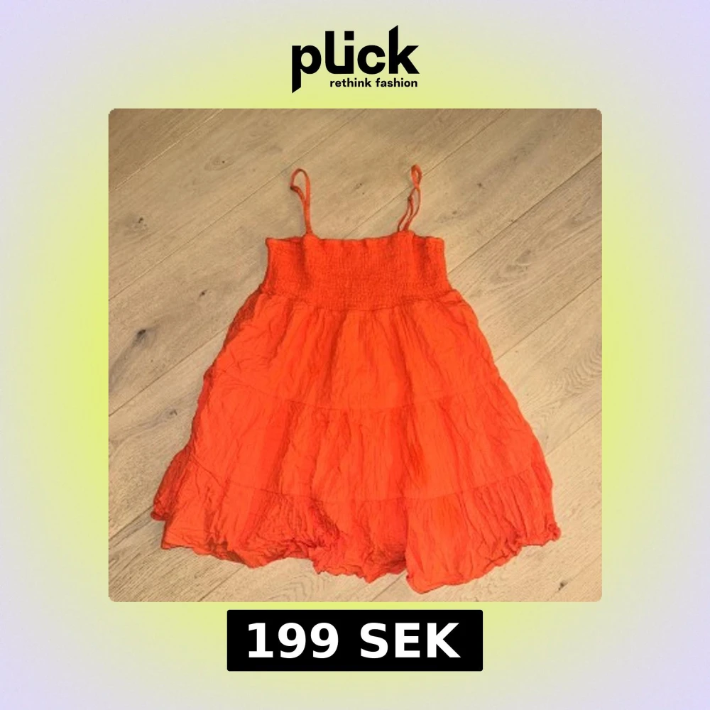 Superfin orange kortklänning från Ghanda (Australien) med smock upptill och tunna axelband. Klänningen har volangig kjol och är gjord i ett lätt, skrynkligt bomullstyg som känns perfekt för varma dagar. Köpt för 350kr, säljer för 199