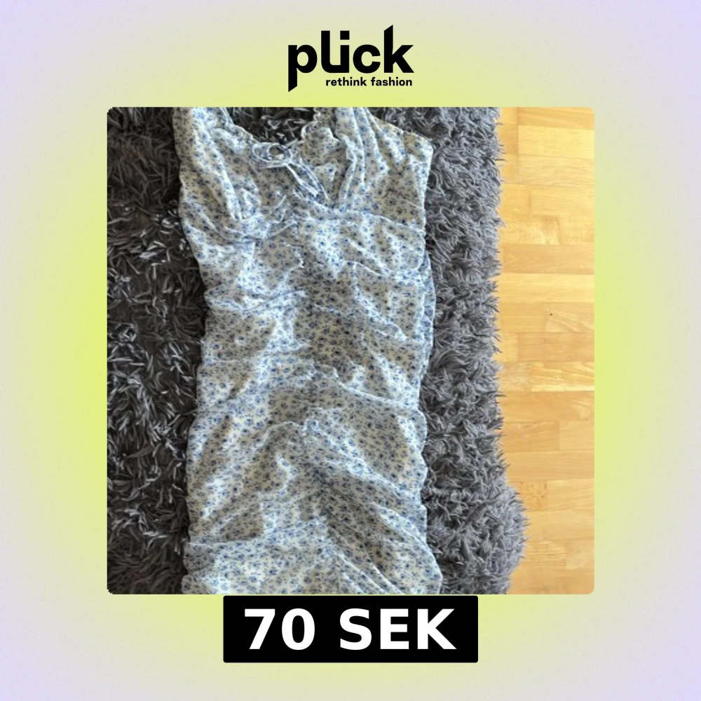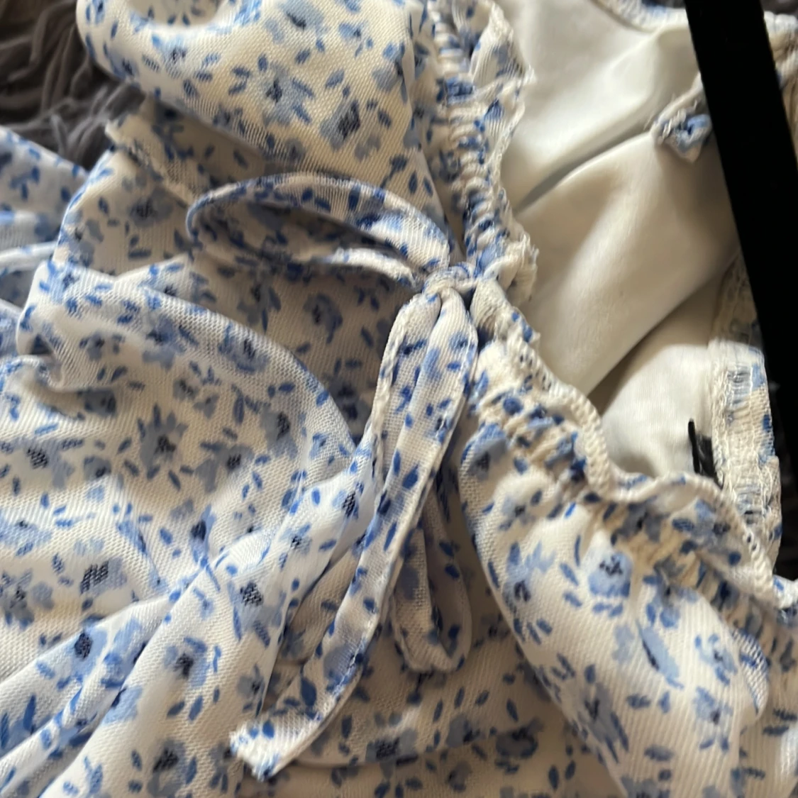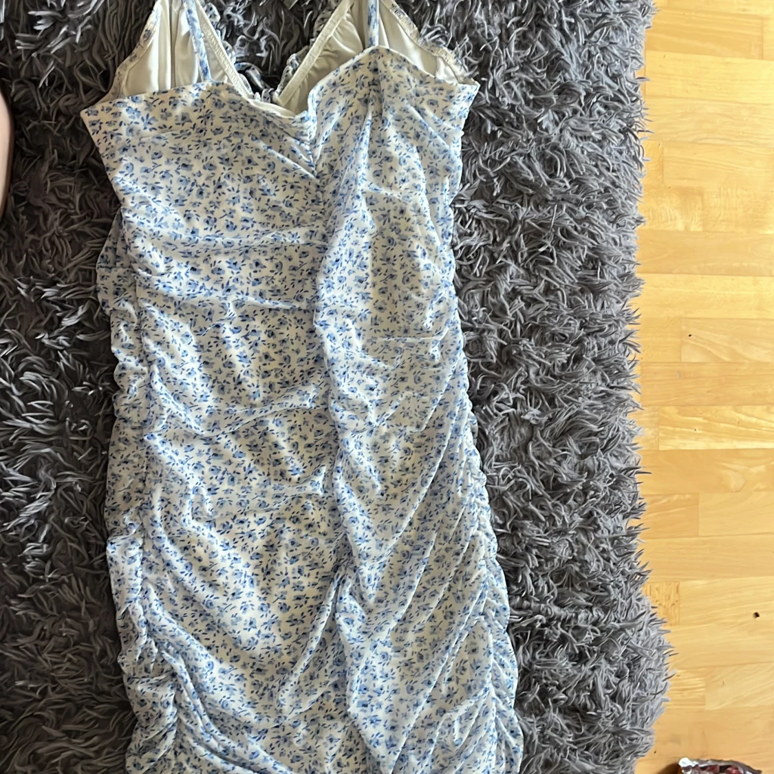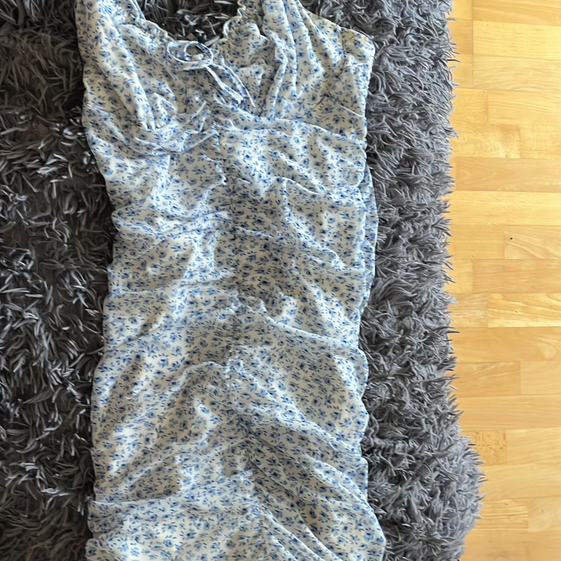 Supersöt långklänning i vitt med blått blommönster och smala axelband. Klänningen har rynkade detaljer längs sidorna och en fin knytning vid bysten. Materialet känns som polyester med ett mjukt innerfoder. Perfekt för sommarens alla tillfällen! Den är i bra skick bara att den är ett par år gammal