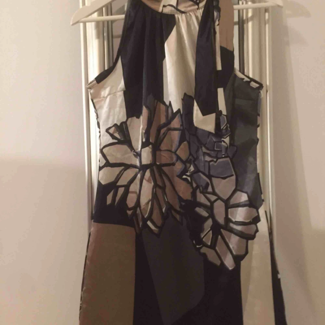 Blå/Brun/Vit Hlterneck som knyts i halsen på sidan. Om Bh kan man ha bh-kryss så inte bnden syns. Glatt och lite glansig, jättesnygg på. Olika mönster fram / bak. Når ca 10 cm ovan knä( jag är 159,5cm)