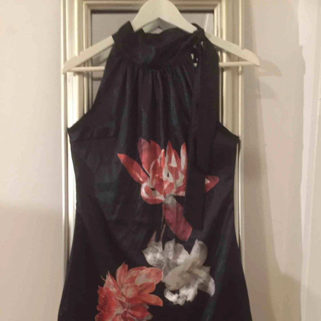 Jättefin Halterneck som knyts runt halsen. Om BH till så bör man använda bh-kryss för att banden ej skall synas. Helt svart baktill. Når till ca 10 cm ovan knän ( på mig, jag är 159,5 cm) Sitter supersnyggt, tyget är glatt och lite blänk i.