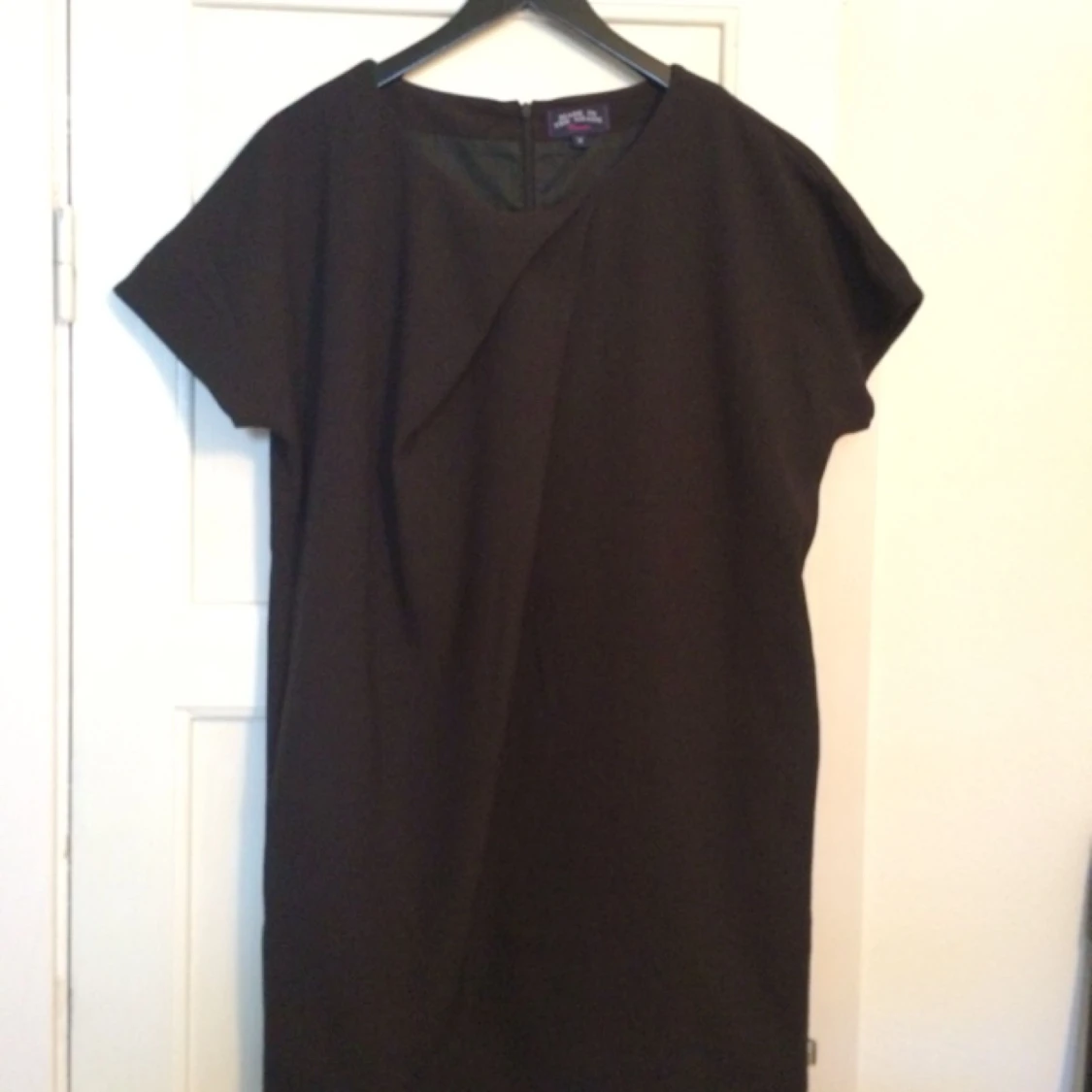 Svart klänning i rak klassisk modell. Skönt fodrat material och fint fall, snygg draperad detalj över bröstet. Längd cirka 87 cm. Strl M. Oanvänd. Kan mötas upp för affär eller skicka!