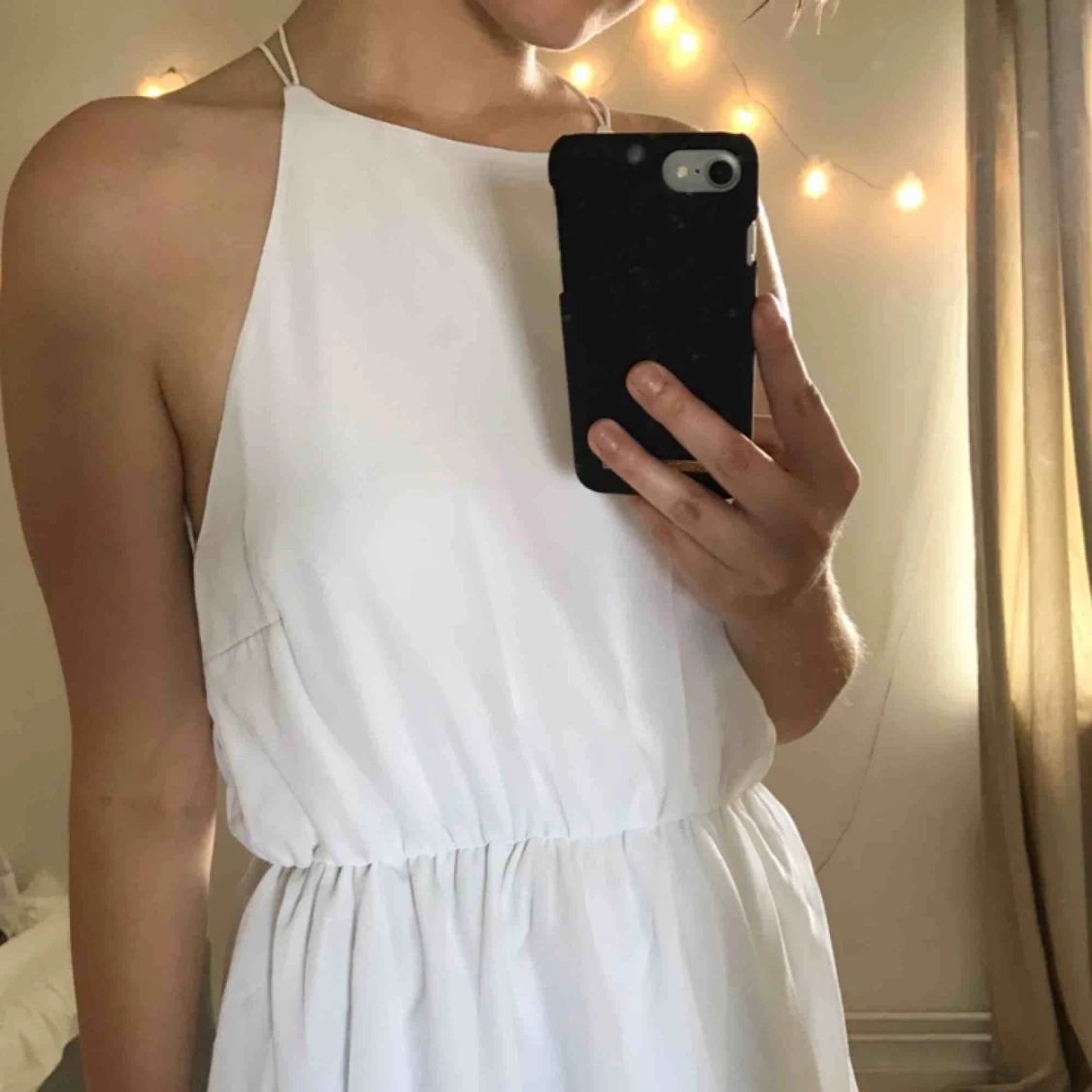 Vit klänning med band som korsas på ryggen 💫 Går till knäna till mig som är 157 cm 💫Köpt på bubbelroom och det står make way på lappen 💫 Säljes pga att den är för stor för mig. Köparen står för frakten eller så kan jag mötas upp i Växjö 💫