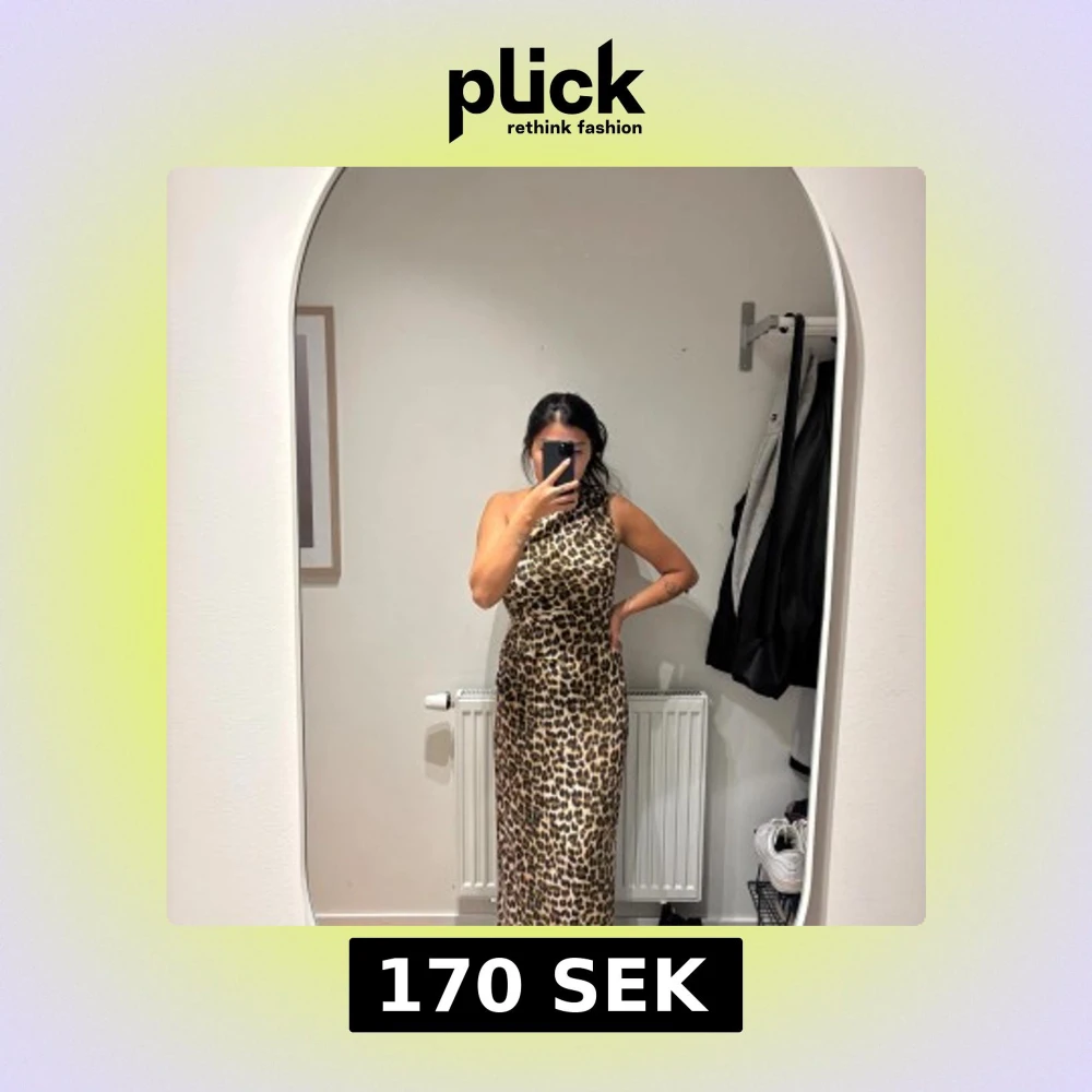 Säljer en snygg långklänning med leopardmönster och oneshoulder-design. Klänningen har en tight passform och en liten slits framtill. Från Mango i Malaga