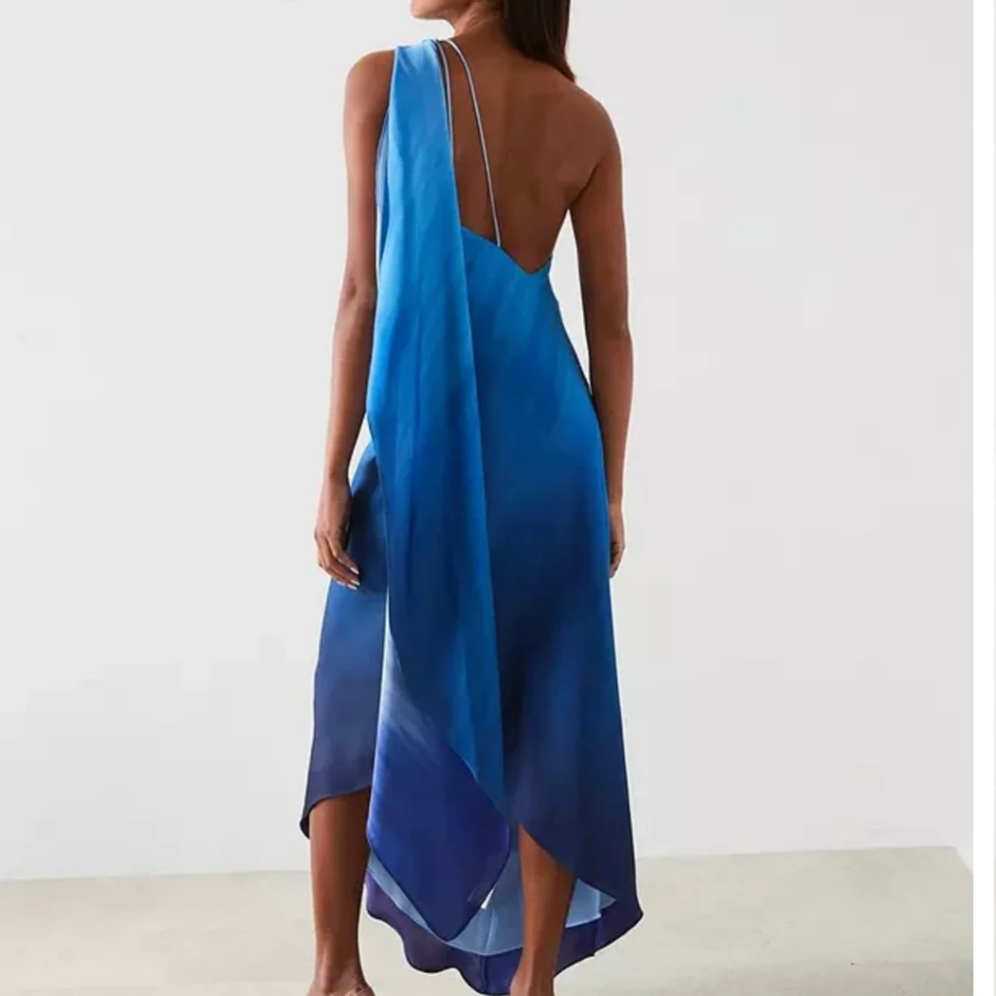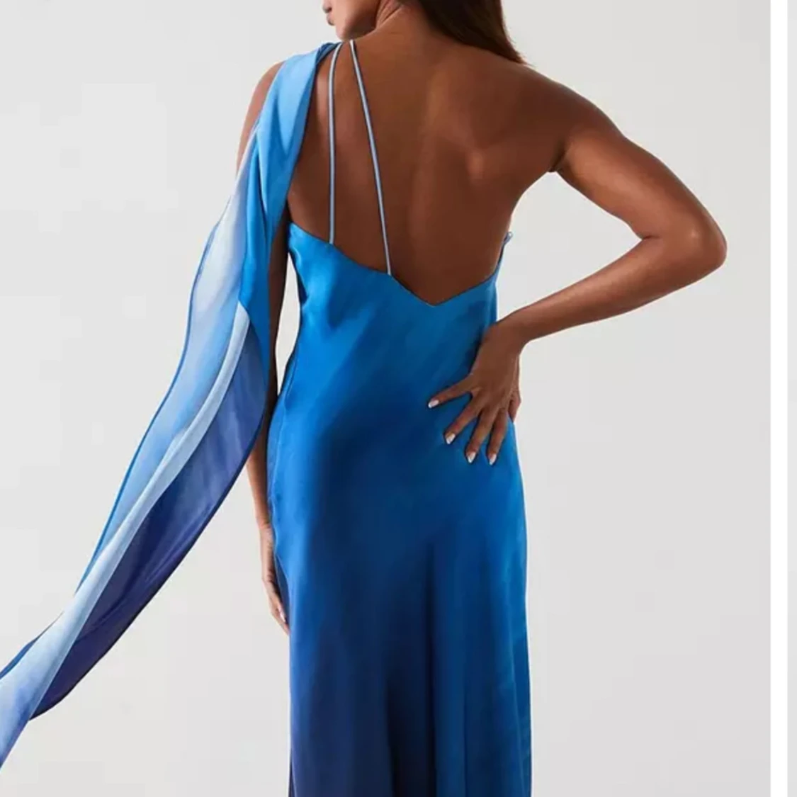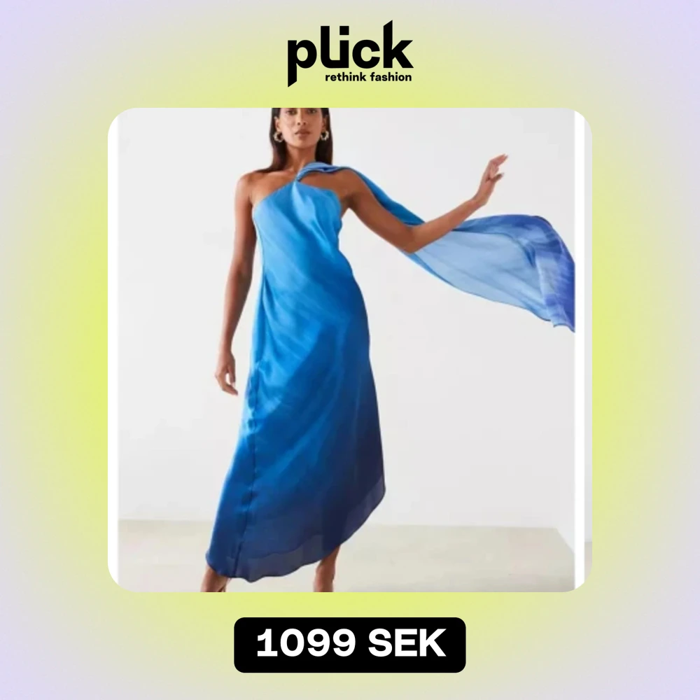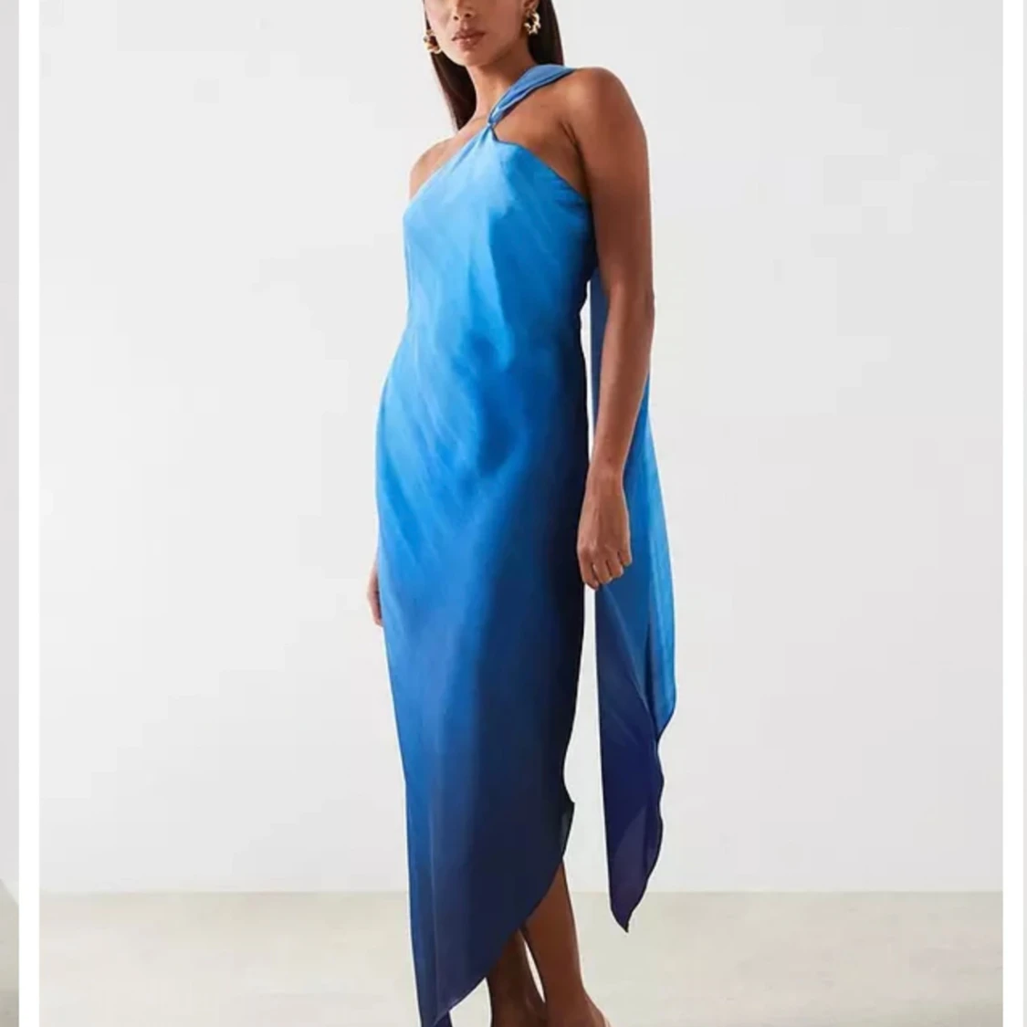 Oanvänd blå klänning från Mango. Nyskick. Blå asymmetrisk satin klänning. Slutsåld överallt. Storlek S ”Asymmetrisk klänning degradé”