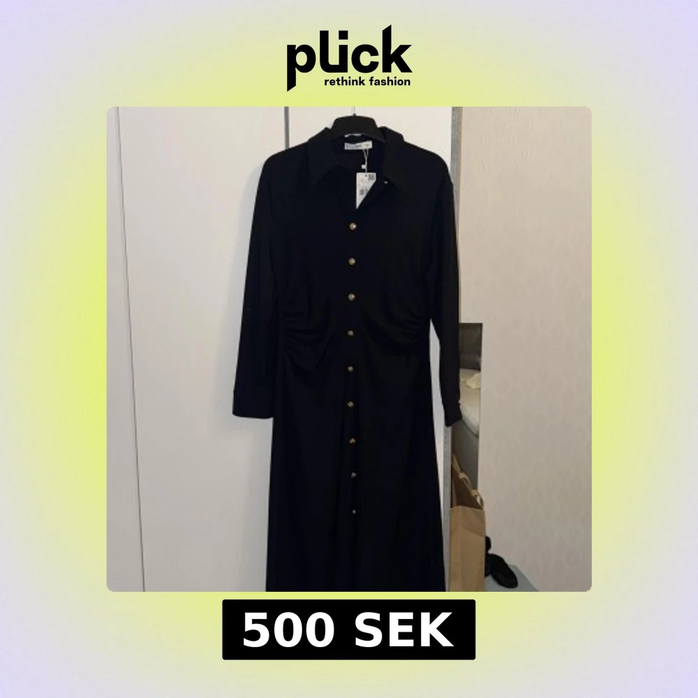 Stilren mörkt marinblå långklänning från Mango med klassisk krage och guldknappar hela vägen framtill. Klänningen har långa ärmar och lätt rynkade detaljer vid midjan för en snygg siluett. Perfekt för dig som gillar en elegant och tidlös look.