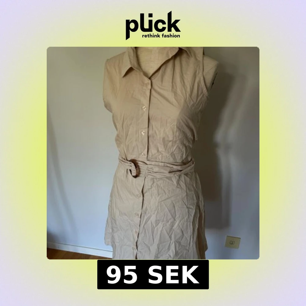 Stilren beige skjortklänning med knappar framtill och tillhörande bälte med spänne i midjan. Klänningen är ärmlös och har klassisk krage, perfekt för en avslappnad och trendig look. Tillverkad i lätt bomullstyg som känns svalt och bekvämt.
