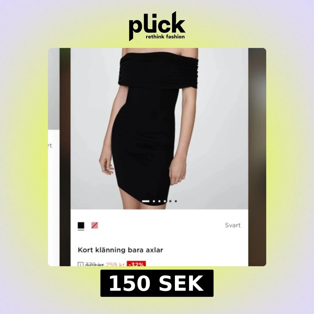 Snygg svart kort klänning med offshoulder-design och figurnära passform🖤. Klänningen har en bred, rynkad kant upptill. Jag hade glömt returnera varan så tiden gick ut:/ den är helt helt ny med lapp på!