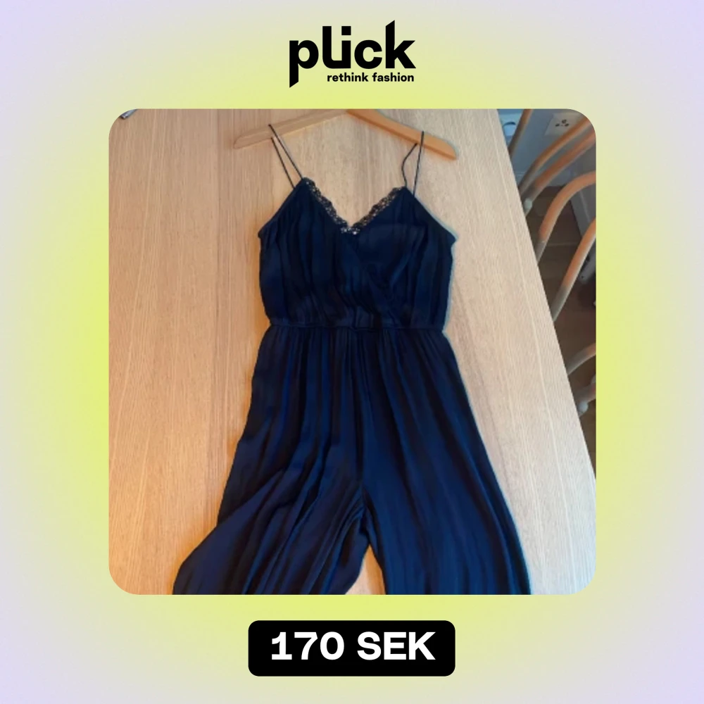 Lång marinblå jumpsuit i satintyg. Fint skick. Storlek S.