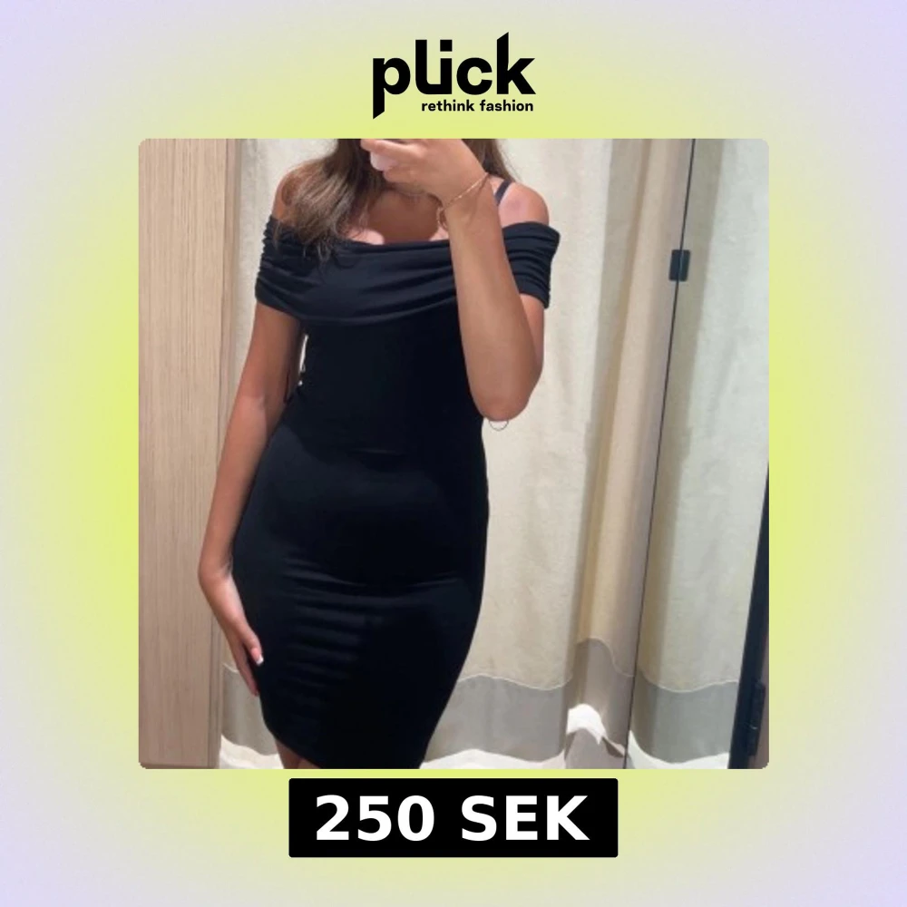 Säljer en svart, tight klänning med offshoulder-design. Klänningen har en smickrande passform och är perfekt för dig som gillar en stilren och enkel look. Materialet känns mjukt och följsamt mot kroppen.