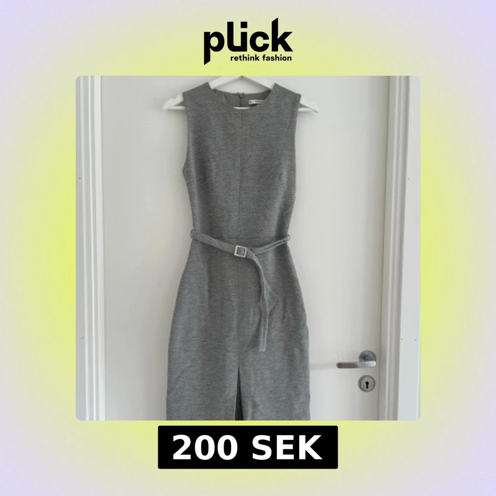 Snygg grå långklänning från Mango med diskret mönster, ärmlös design och tillhörande bälte i midjan.