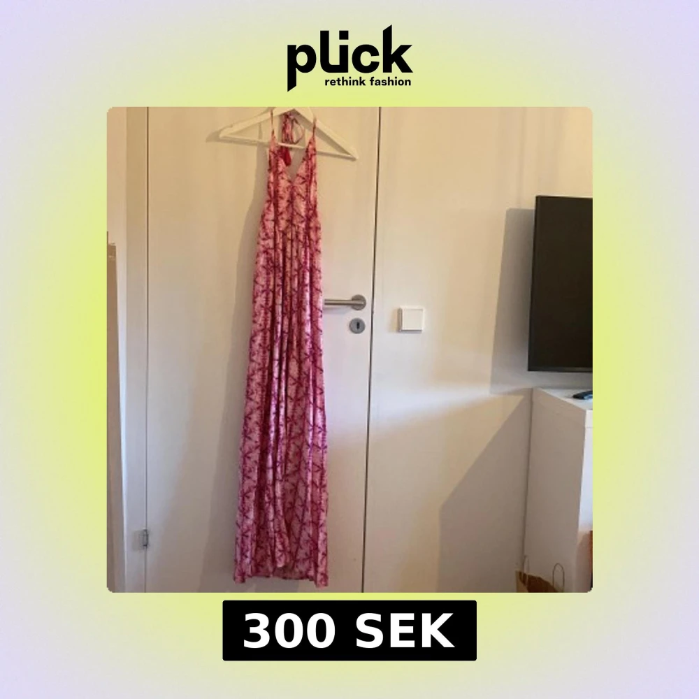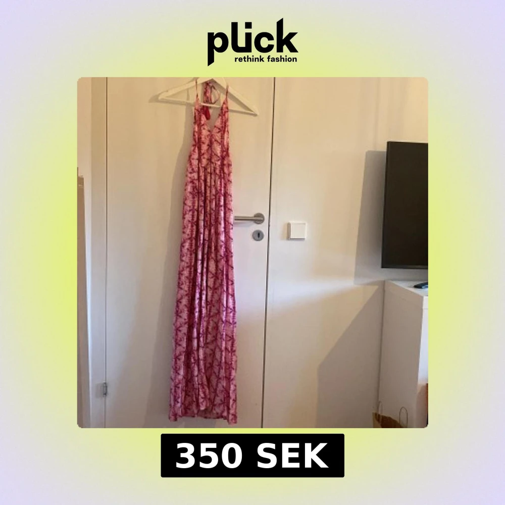 Snygg långklänning från Mango i rosa och rött mönster. Klänningen har halterneck med knytband och tofsar, v-ringad front och ett flowigt fall. Helt ny med lapp🩷