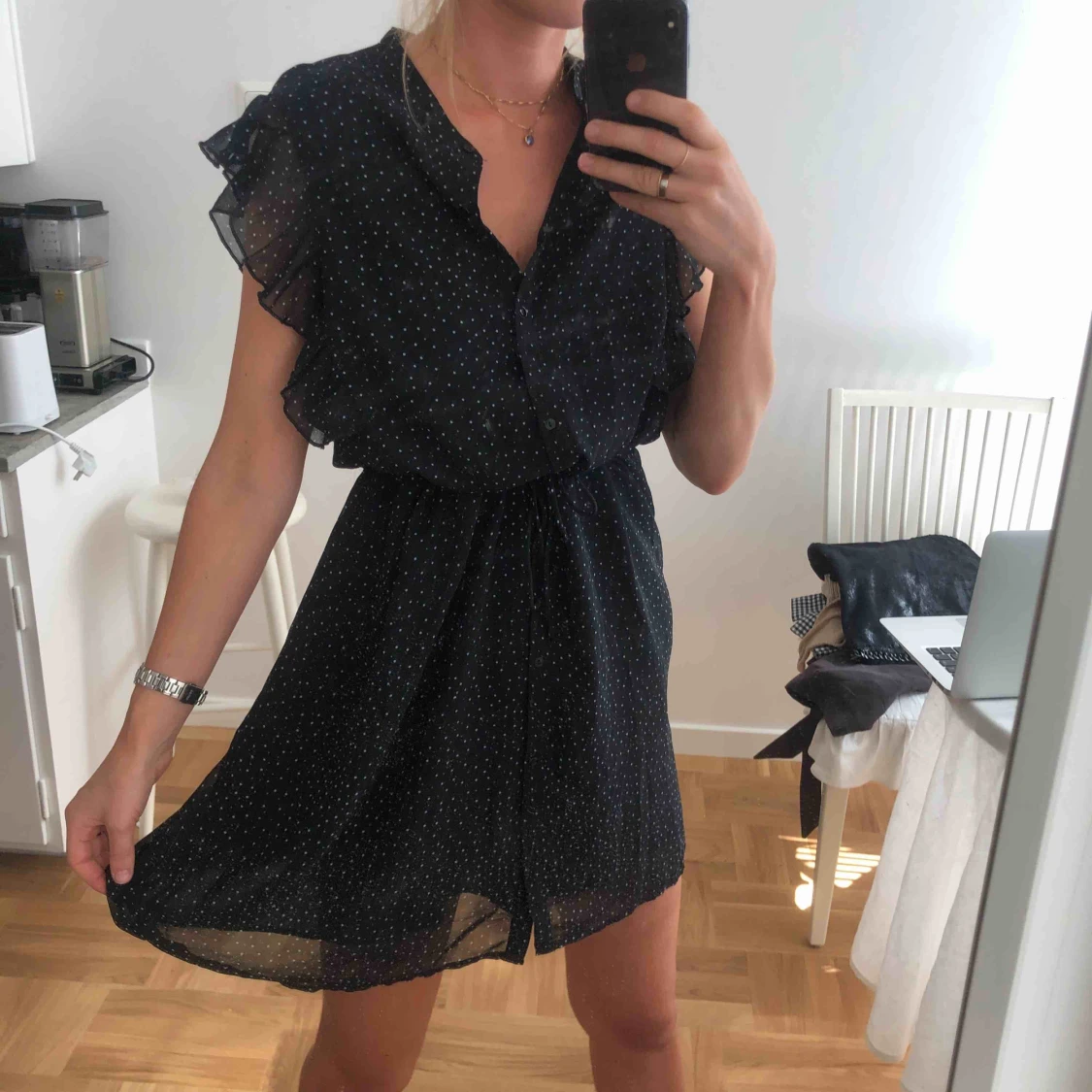 Jättefin svartvit prickig klänning från mango, är storlek L men passar på mig som är storlek S eftersom man knyter ihop den i midjan. Aldrig använd. Köparen står för frakt, alternativt mötas upp i Stockholm ☺️