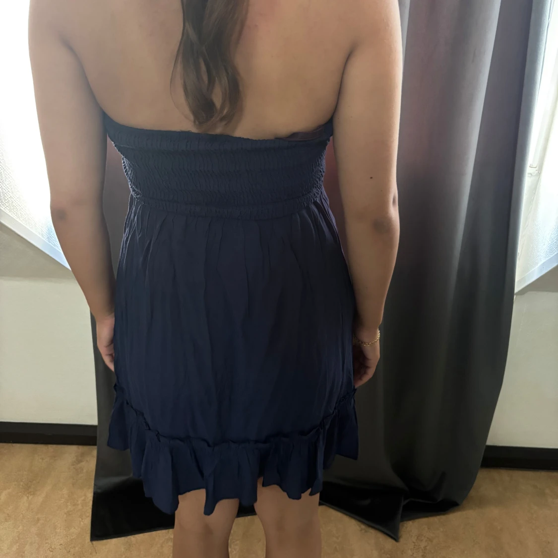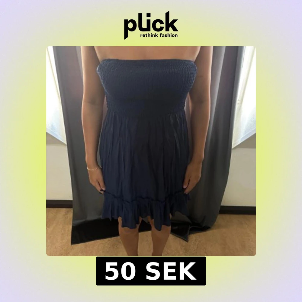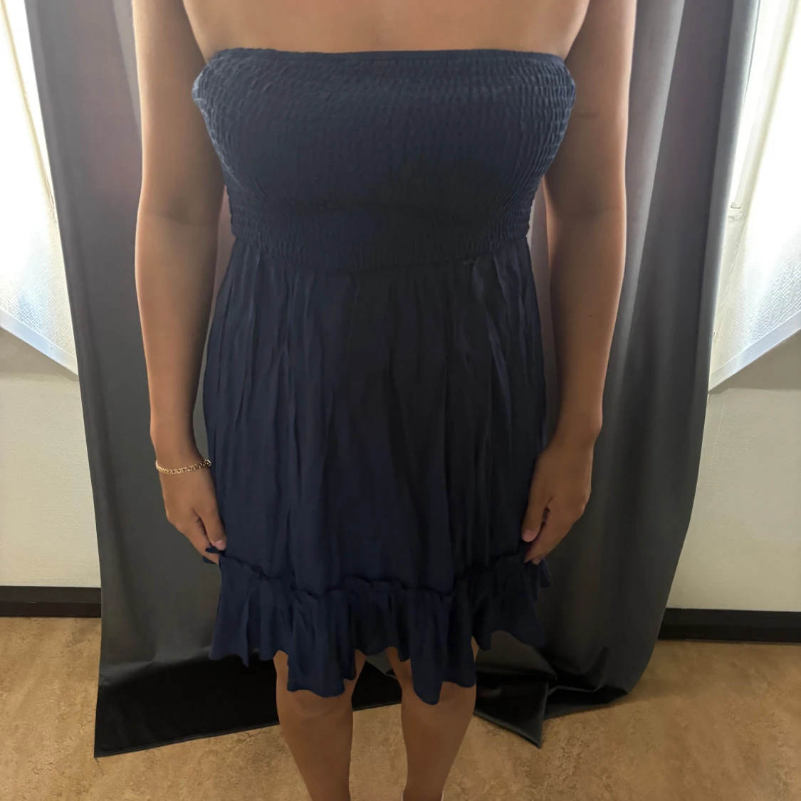 Säljer en marinblå axelbandslös kortklänning med smockad överdel och volangkant nertill. Klänningen har en luftig och lätt känsla, perfekt för varma dagar. Enkel och stilren design som är lätt att matcha med accessoarer.
