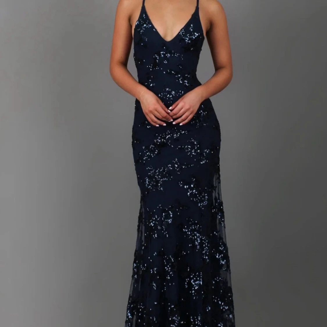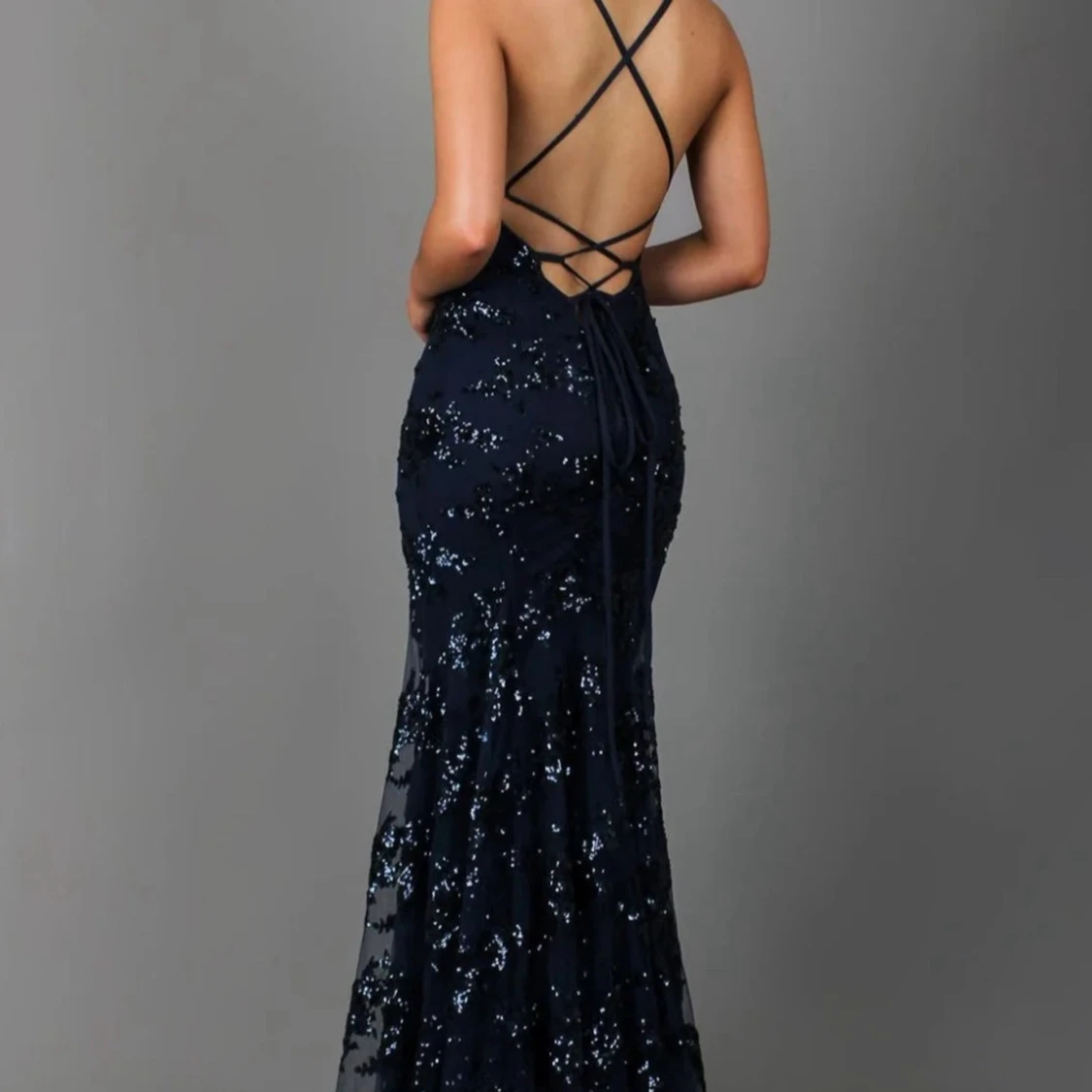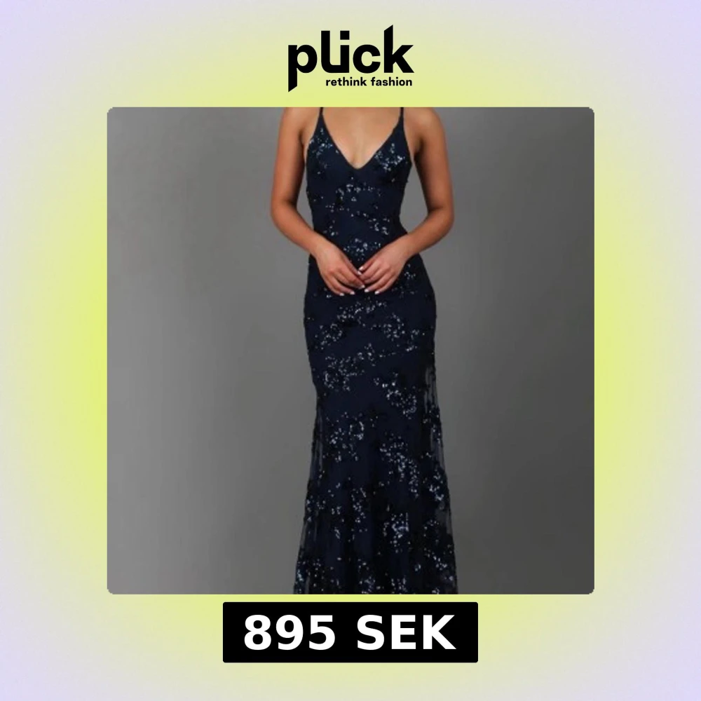 Supersnygg marinblå balklänning med smala axelband och öppen rygg med snörning. Klänningen är täckt av glittriga paljetter och har en figurnära passform som ger en elegant siluett. Perfekt för bal eller festliga tillfällen när du vill sticka ut. Aldrig använd då den ej passade 🩷