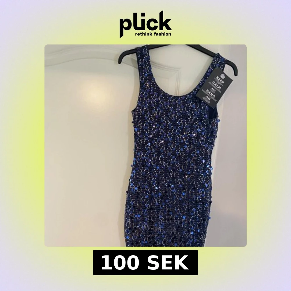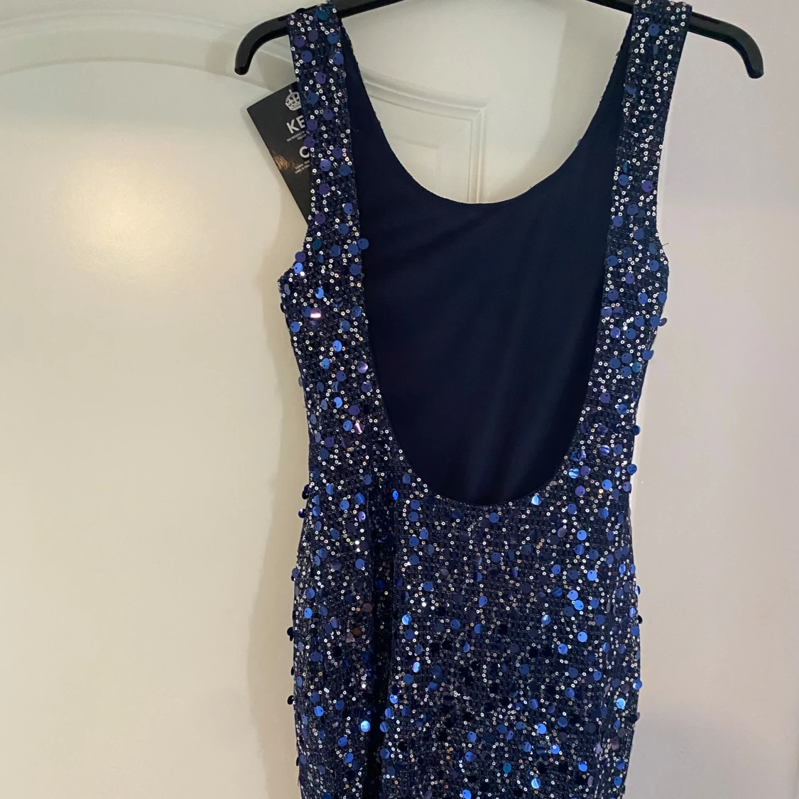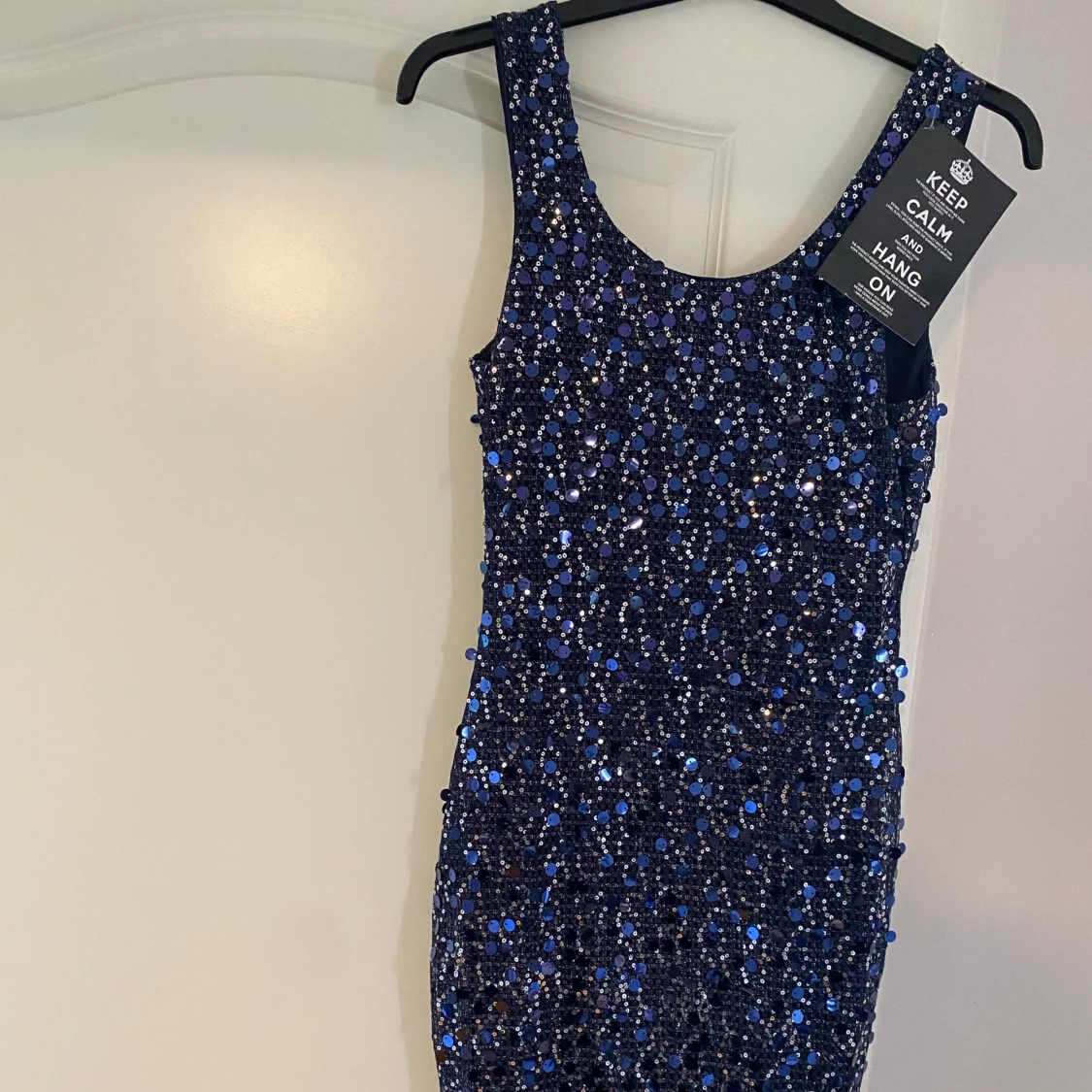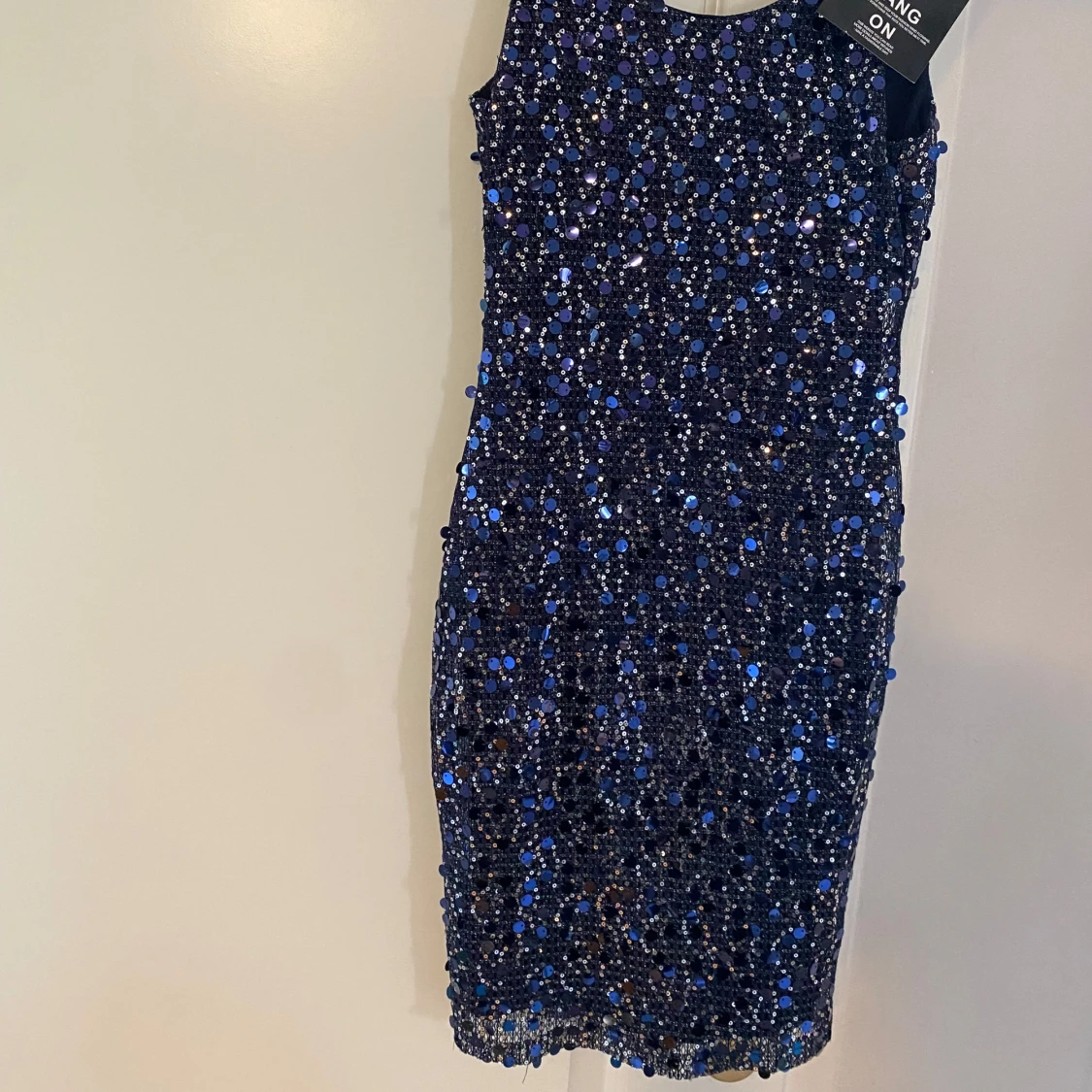 Säljer en marinblå tight klänning täckt av glittrande paljetter. Klänningen är ärmlös med rund halsringning och har en kroppsnära passform som framhäver siluetten. Perfekt för dig som vill sticka ut på festen! Prislappen är även på.