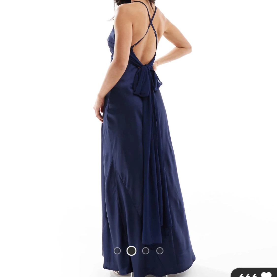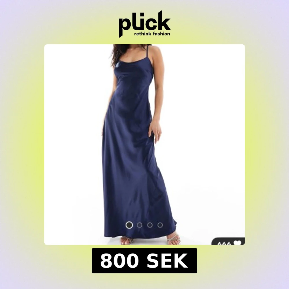 Snygg marinblå långklänning i satinliknande material med smala axelband och öppen rygg. Klänningen har en stor rosett bak och ett elegant, figurnära fall. Perfekt för dig som vill sticka ut med en stilren och trendig look. Helt oöppnad, ursprungspris 1139💗