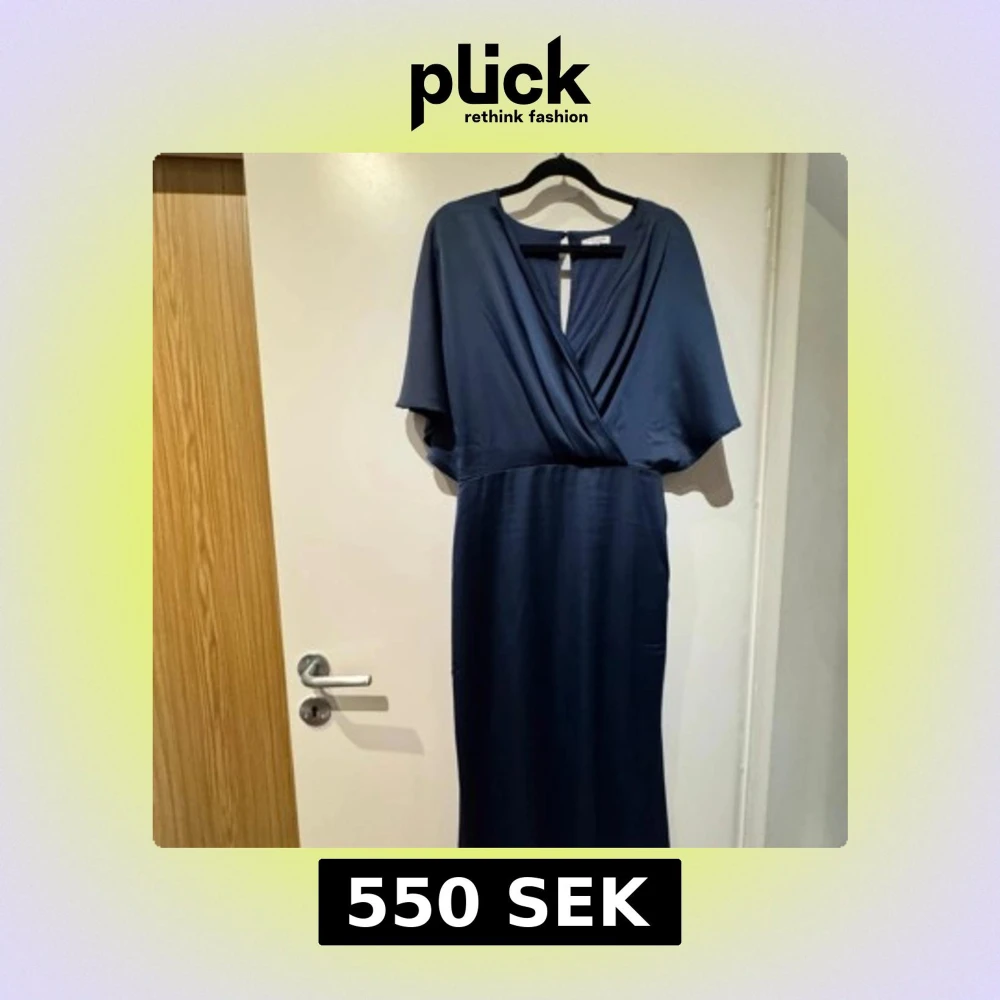 Snygg marinblå långklänning med omlott framtill och v-ringad hals. Klänningen har vida, korta ärmar och en elegant öppning i ryggen med knapp. Materialet är mjukt och har en lätt glansig finish som ger en lyxig känsla.