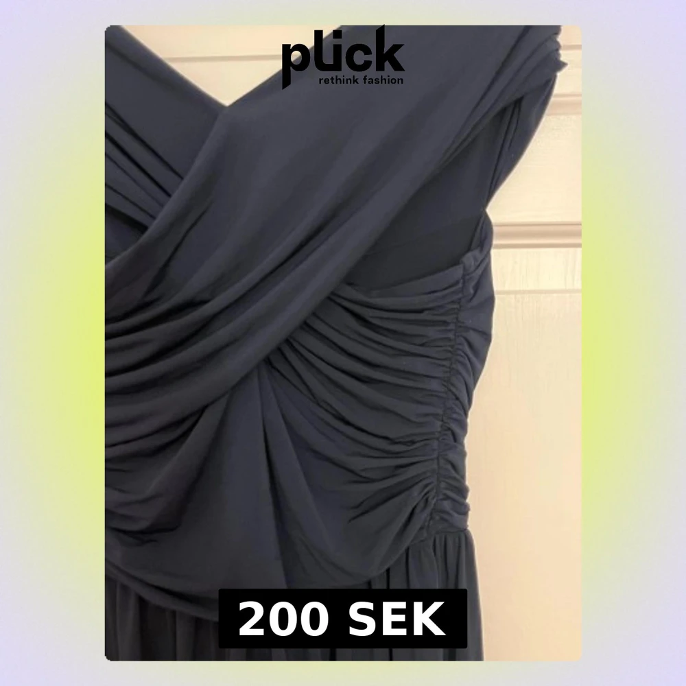 Snygg marinblå långklänning från H&M med omlott-detalj upptill och draperad v-ringad överdel. Klänningen är axelbandslös och har ett mjukt, flytande tyg som ger en elegant siluett. Perfekt för dig som vill ha en stilren look med lite extra edge.