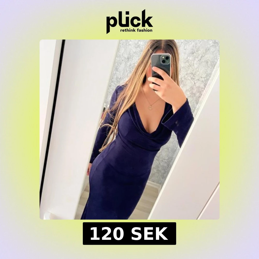 Säljer en marinblå långklänning med lång ärm och djup draperad ringning framtill. Klänningen har en figurnära passform och är gjord i ett mjukt, stretchigt material som ger en snygg siluett. Perfekt för dig som vill ha en elegant look. Den är jättebekväm och strechig och aldrig använd. Vid frågor hör av dig!