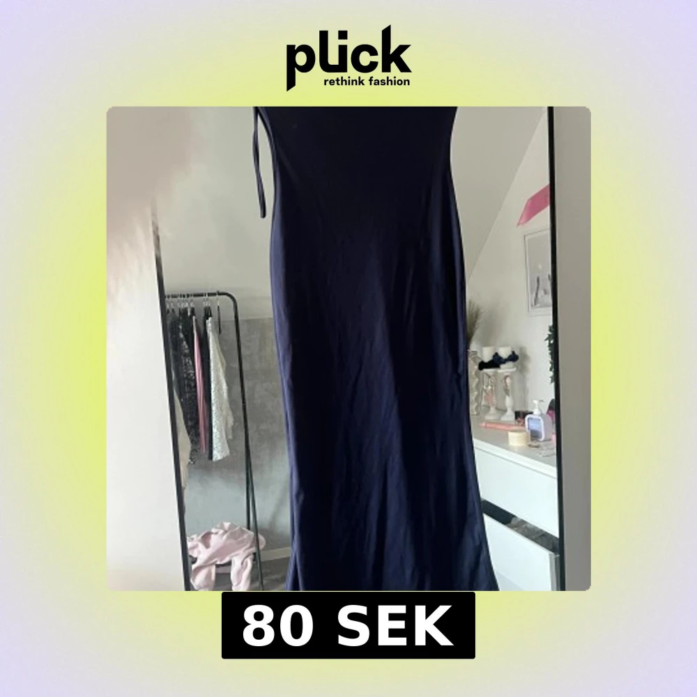 En stilren marinblå långklänning med smala axelband och figurnära passform. Klänningen är ärmlös och har en enkel, elegant siluett som passar perfekt för dig som gillar minimalistisk stil.