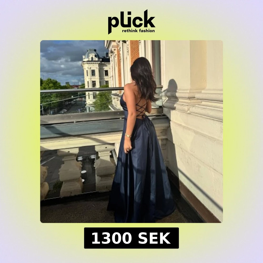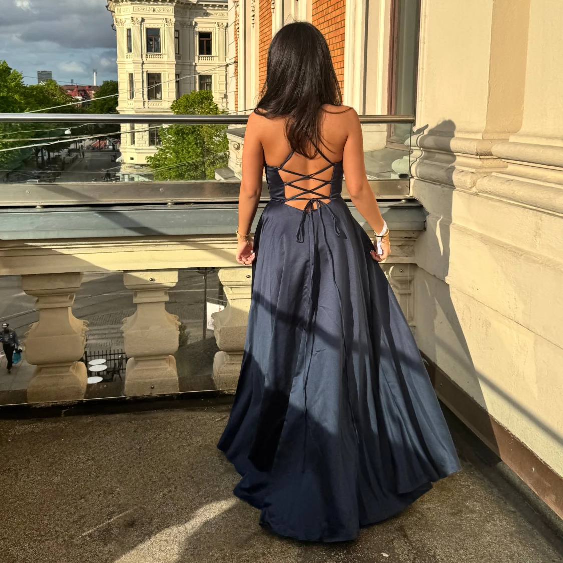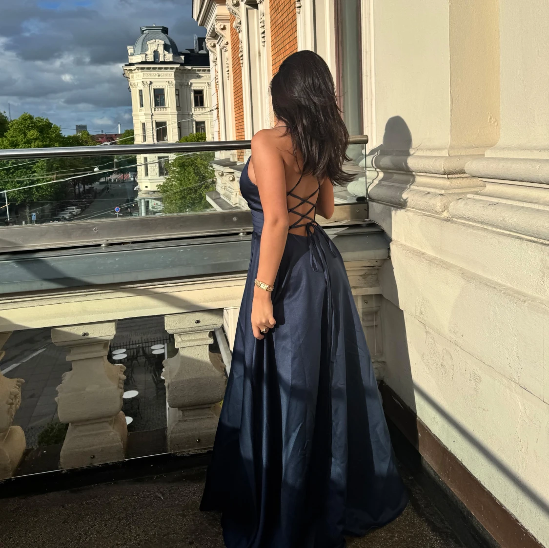 Elegant marinblå långklänning med öppen rygg och snygg snörning baktill. Klänningen har smala axelband, v-ringad omlott framtill och ett svepande, utsvängt fall. Perfekt för bal eller festliga tillfällen. Materialet har en lätt glansig finish som ger en lyxig känsla.