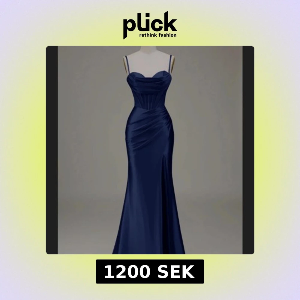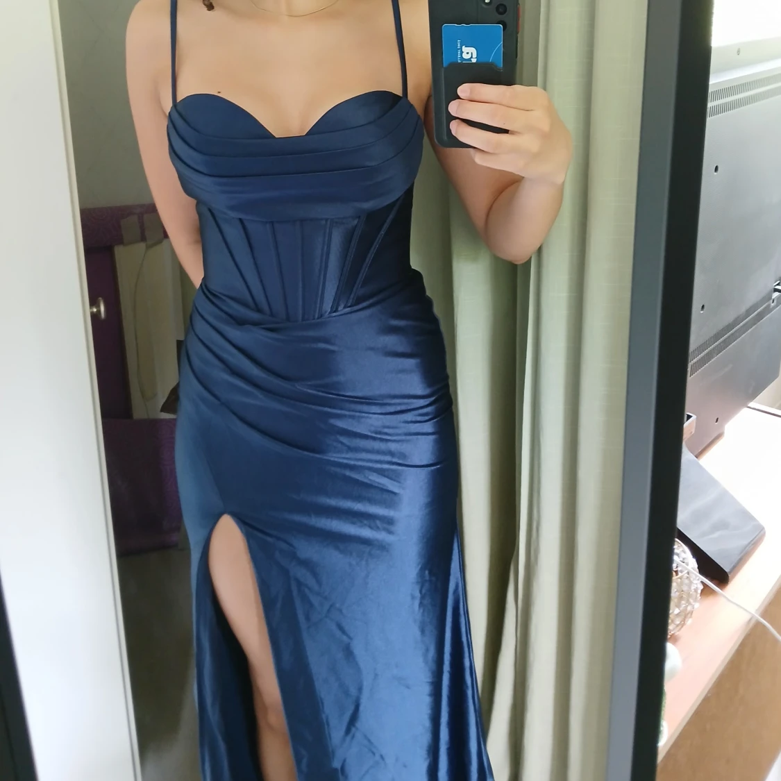 Säljer en elegant marinblå långklänning i satin med smala axelband, draperad byst och figurnära passform. Klänningen har snörning i ryggen och en hög slits framtill som ger en snygg siluett. Perfekt för bal eller fest!