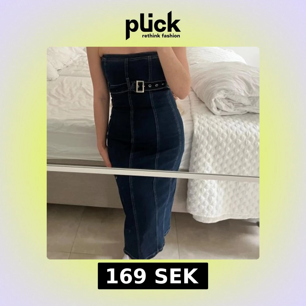 Säljer en mörkblå, axelbandslös jeansklänning med markerade sömmar och ett snyggt bälte i midjan. Klänningen är lång och har en tight passform som framhäver figuren. Köpt utomlands och aldrig använd , som ny!