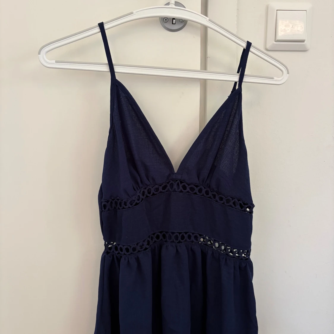 Snygg marinblå klänning med smala axelband och v-ringning. Klänningen har dekorativa spetsdetaljer under bysten och i midjan, vilket ger en extra touch. Perfekt för varma dagar och har en luftig känsla.