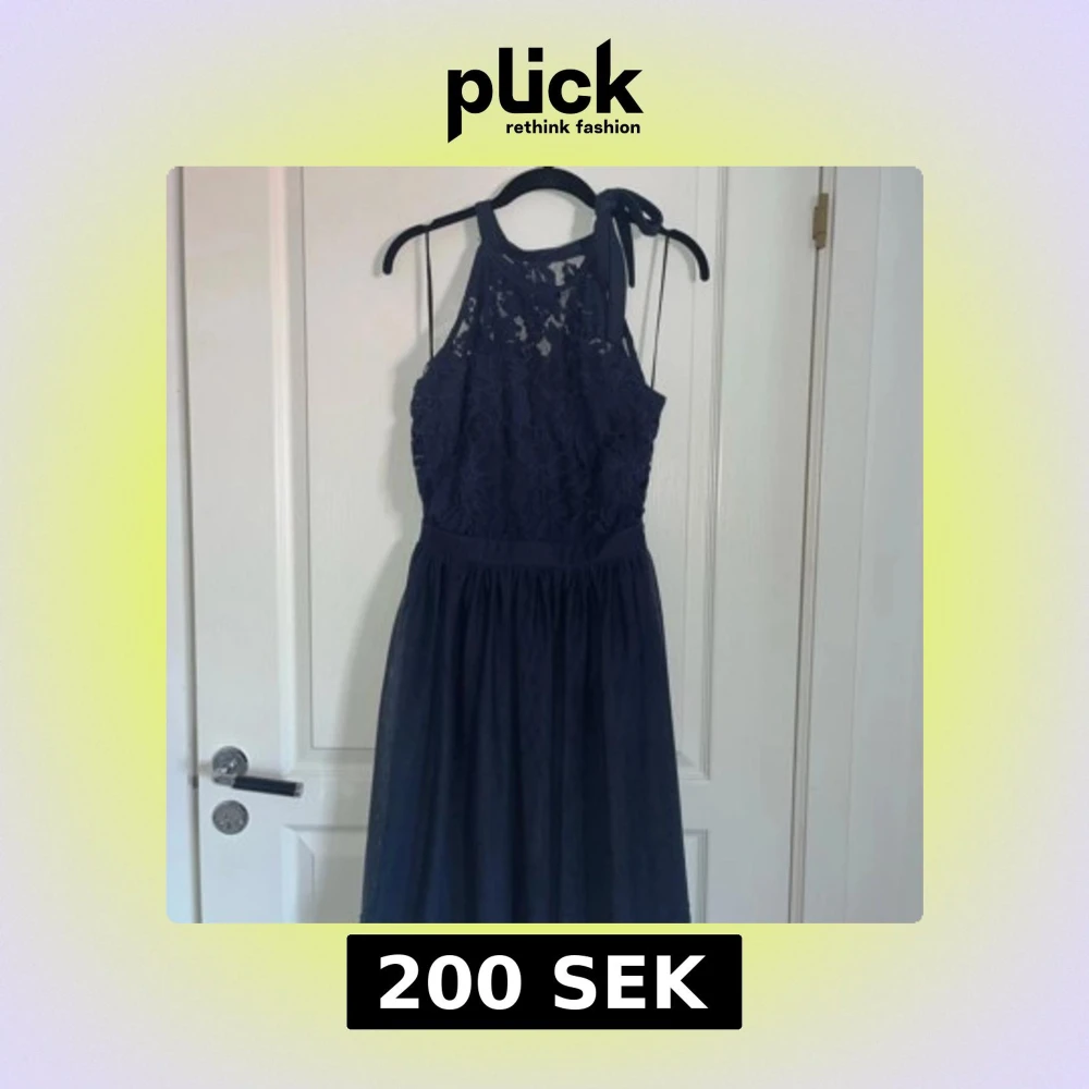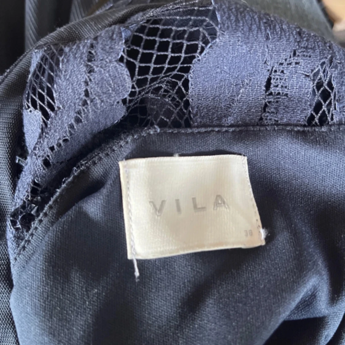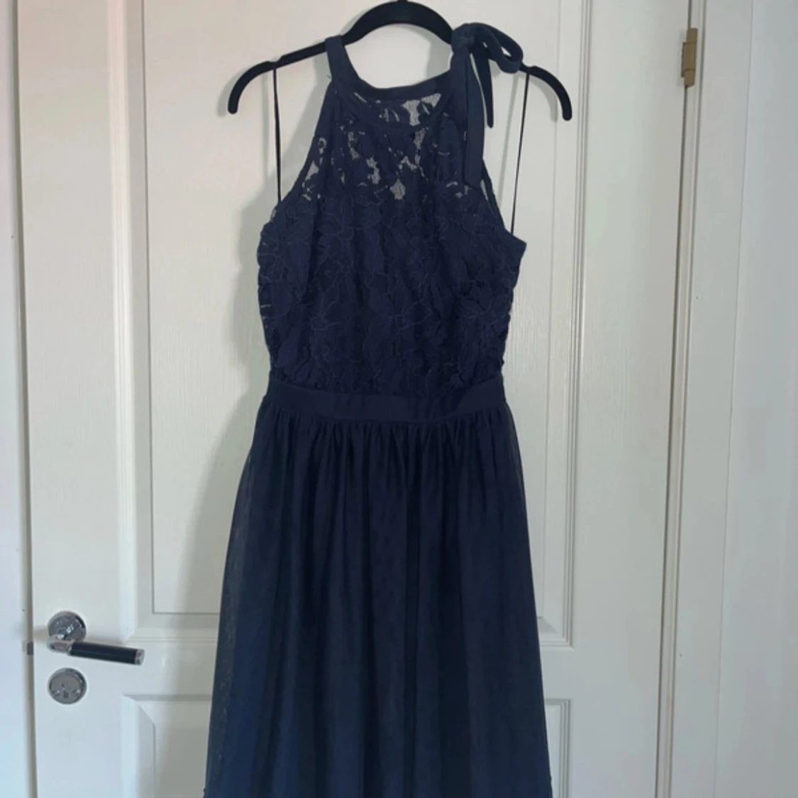 Säljer en marinblå klänning från Vila med spetsdetaljer upptill och knytning vid axeln. Klänningen har ärmlös design och en lätt utställd kjol i chiffongliknande material. Perfekt för speciella tillfällen. Strl 38