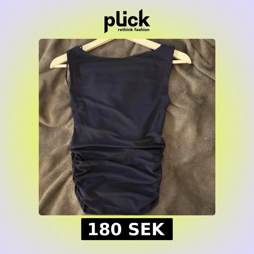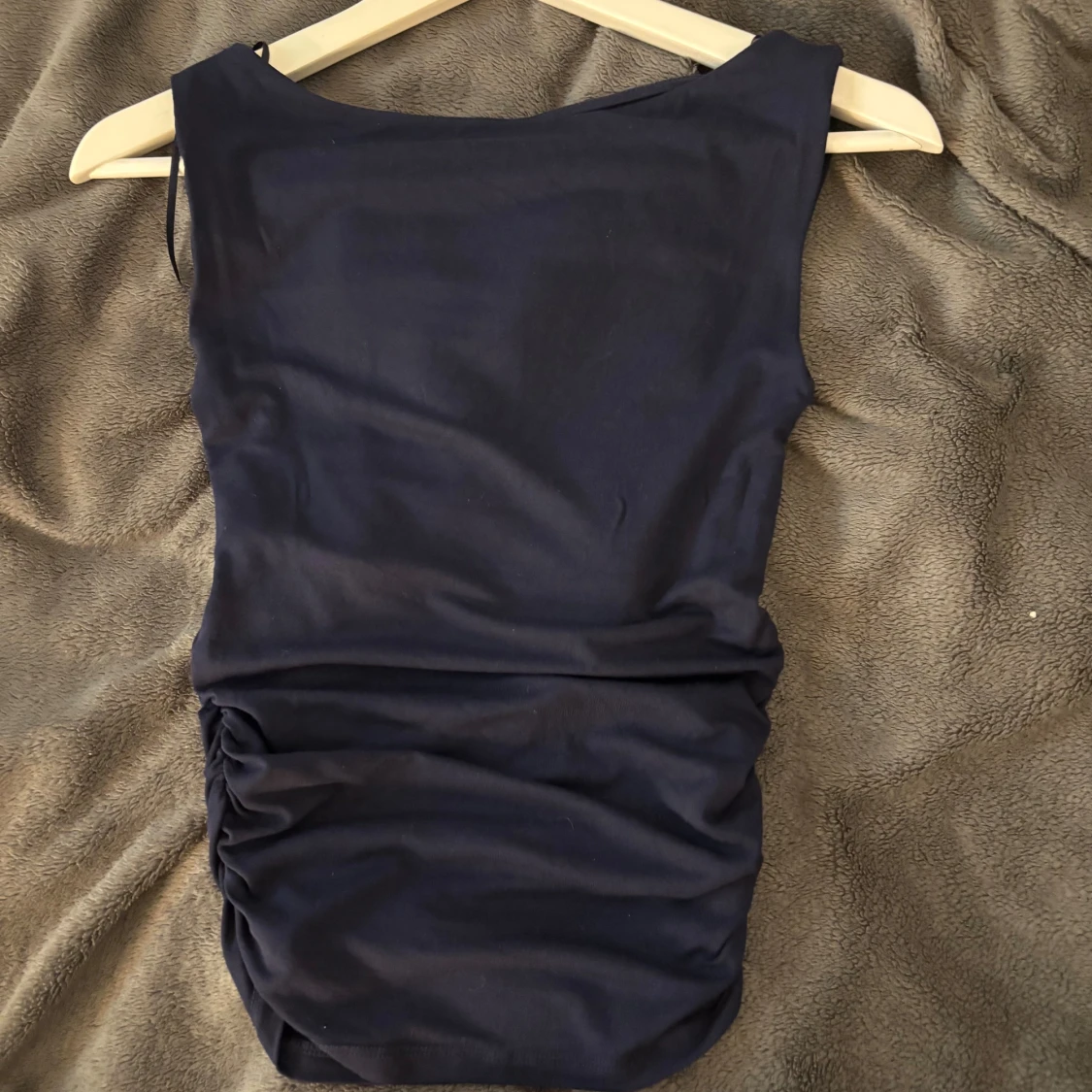 Säljer en marinblå topp från Gina Tricot i storlek XS. Toppen är ärmlös med en tight passform och har snygga rynkade detaljer på sidorna. Perfekt för dig som gillar enkel men stilren design.