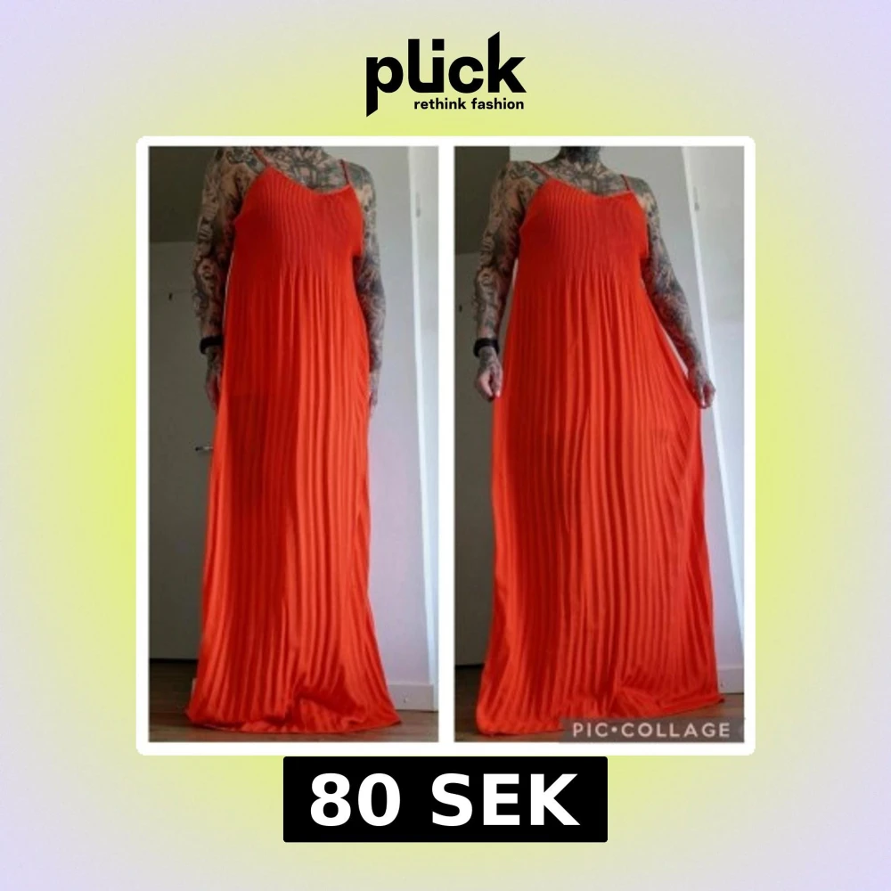 Snygg långklänning i stark orange färg med tunna axelband och plisserad design. Klänningen har en lös passform och är perfekt för varma dagar. Materialet känns lätt och luftigt, vilket ger en skön känsla.