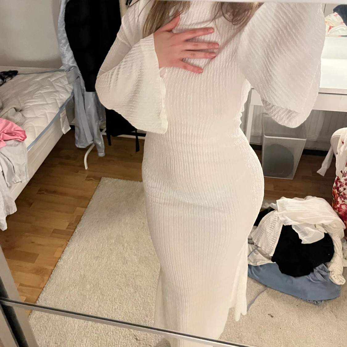 Elegant vit ribbad långklänning med långa ärmar och utsvängda ärmslut. Perfekt för en stilren och sofistikerad look. Modest!