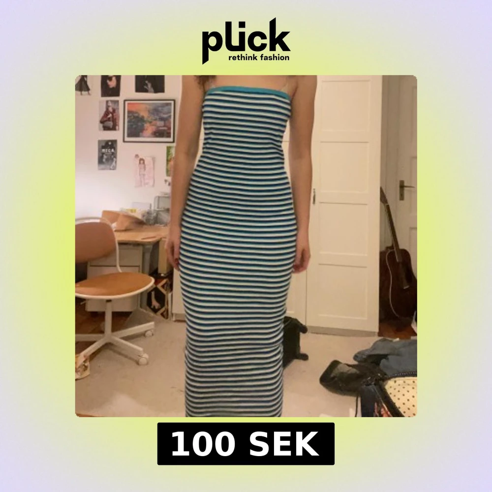 Snygg axelbandslös klänning med blå och vita ränder. Perfekt för en somrig look. Klänningen är lång och har en tight passform.