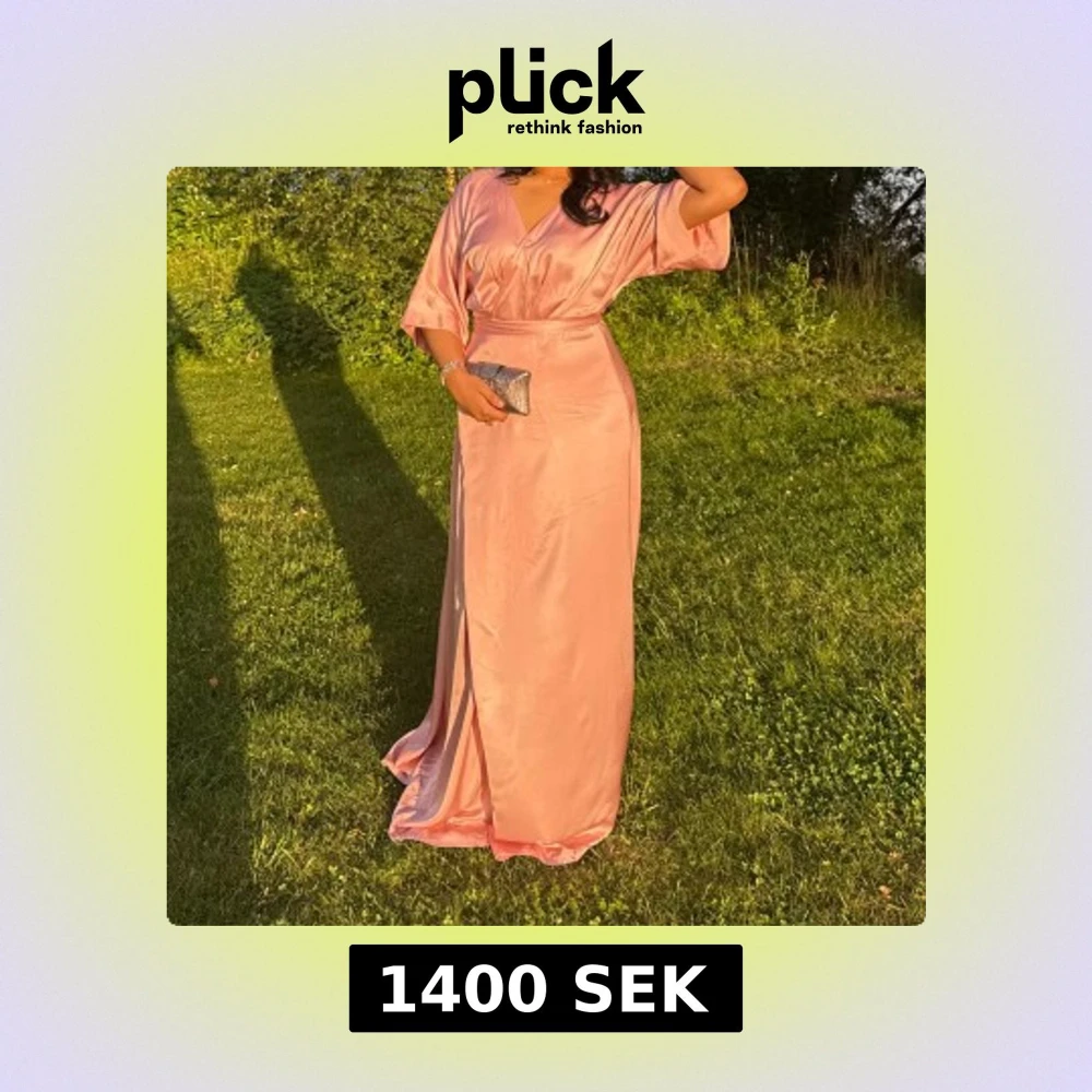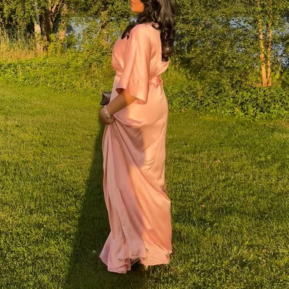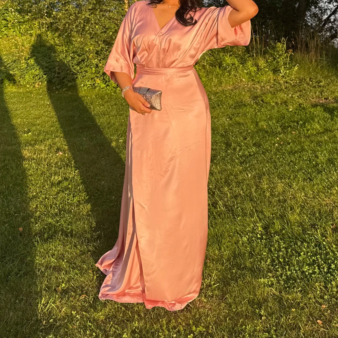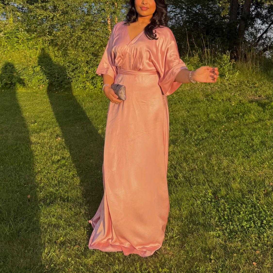 Superfin ljusrosa långklänning i glansigt satinliknande material. Klänningen har v-ringning, vida trekvartsärmar och är omlottsklänning. Perfekt för bal eller sommarens speciella tillfällen. .