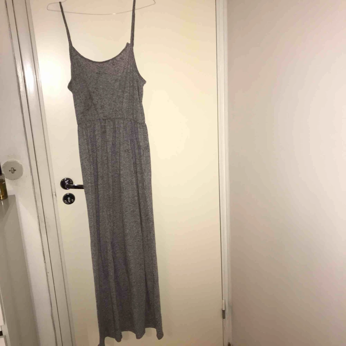En maxi klänning som är grå. Superskönt material,lite sönder upp till men går definitivt att sy ihop.