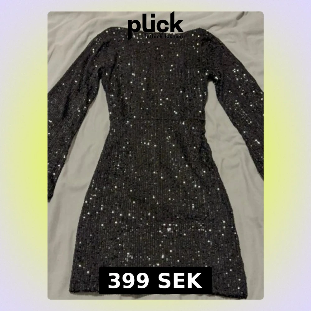 Snygg svart kortklänning med långa ärmar och v-ringning på ryggen. Klänningen är täckt av glittriga paljetter som ger en festlig look. Figurnära passform och stretchigt material för extra komfort. Perfekt för dig som vill sticka ut. Klänningen e ganska kort i längden men ör fortfarande lika snygg!