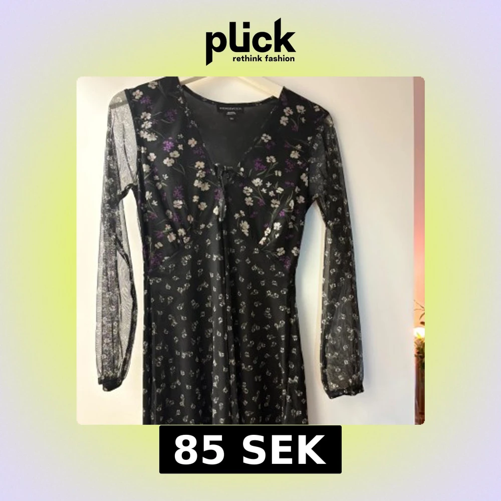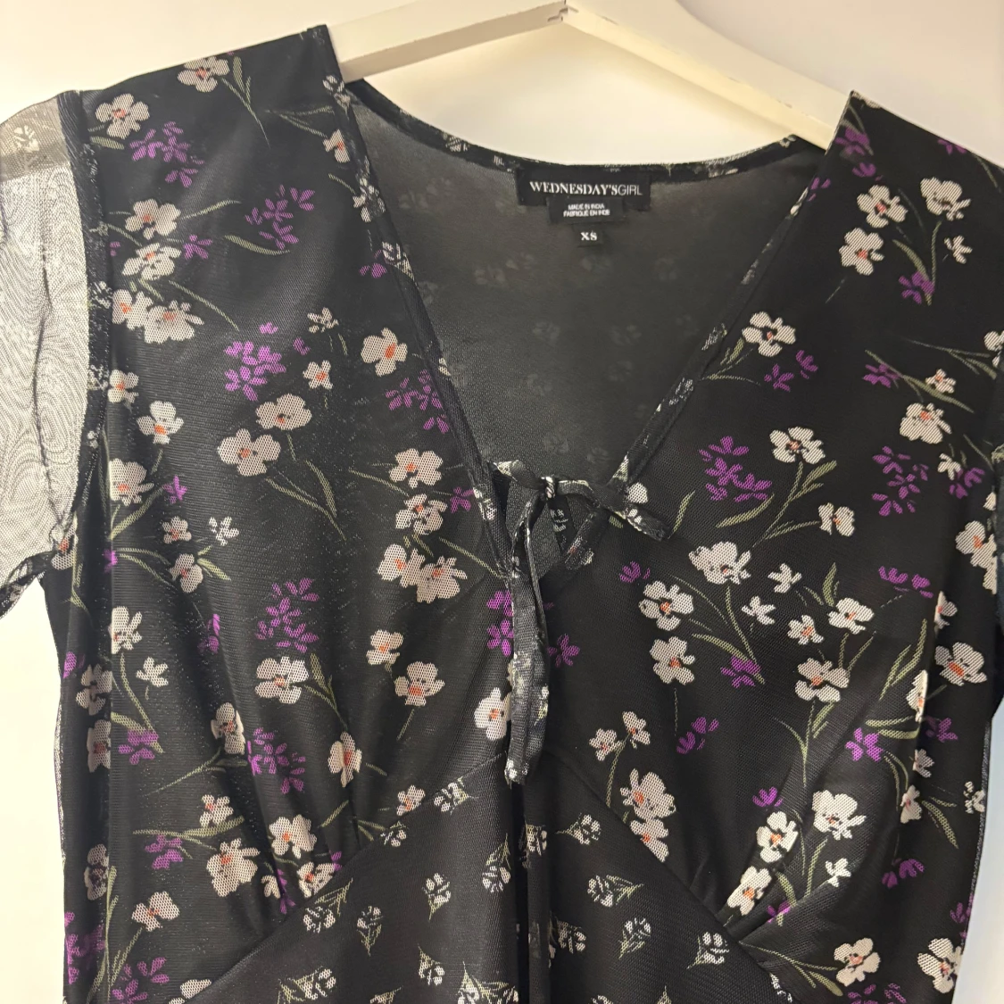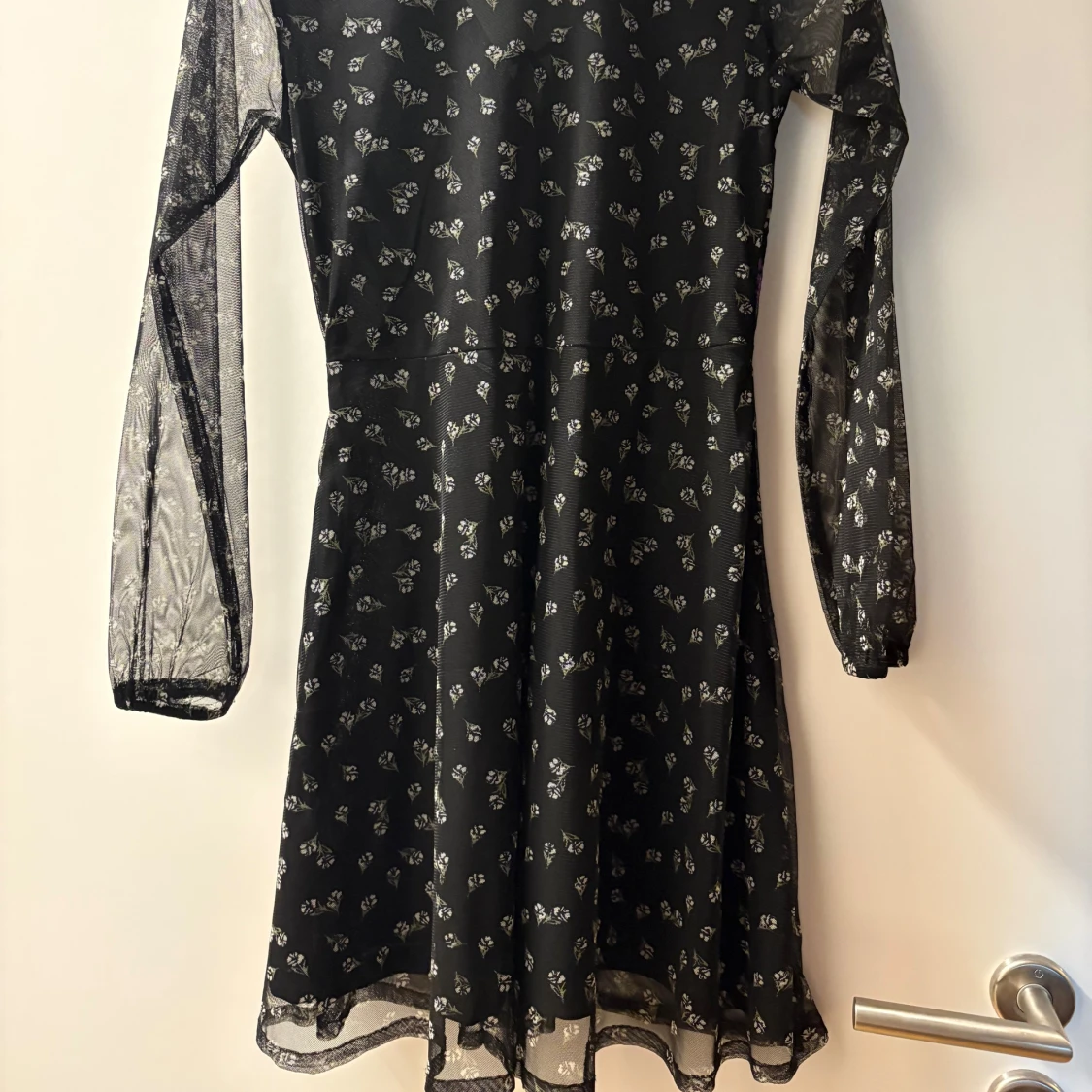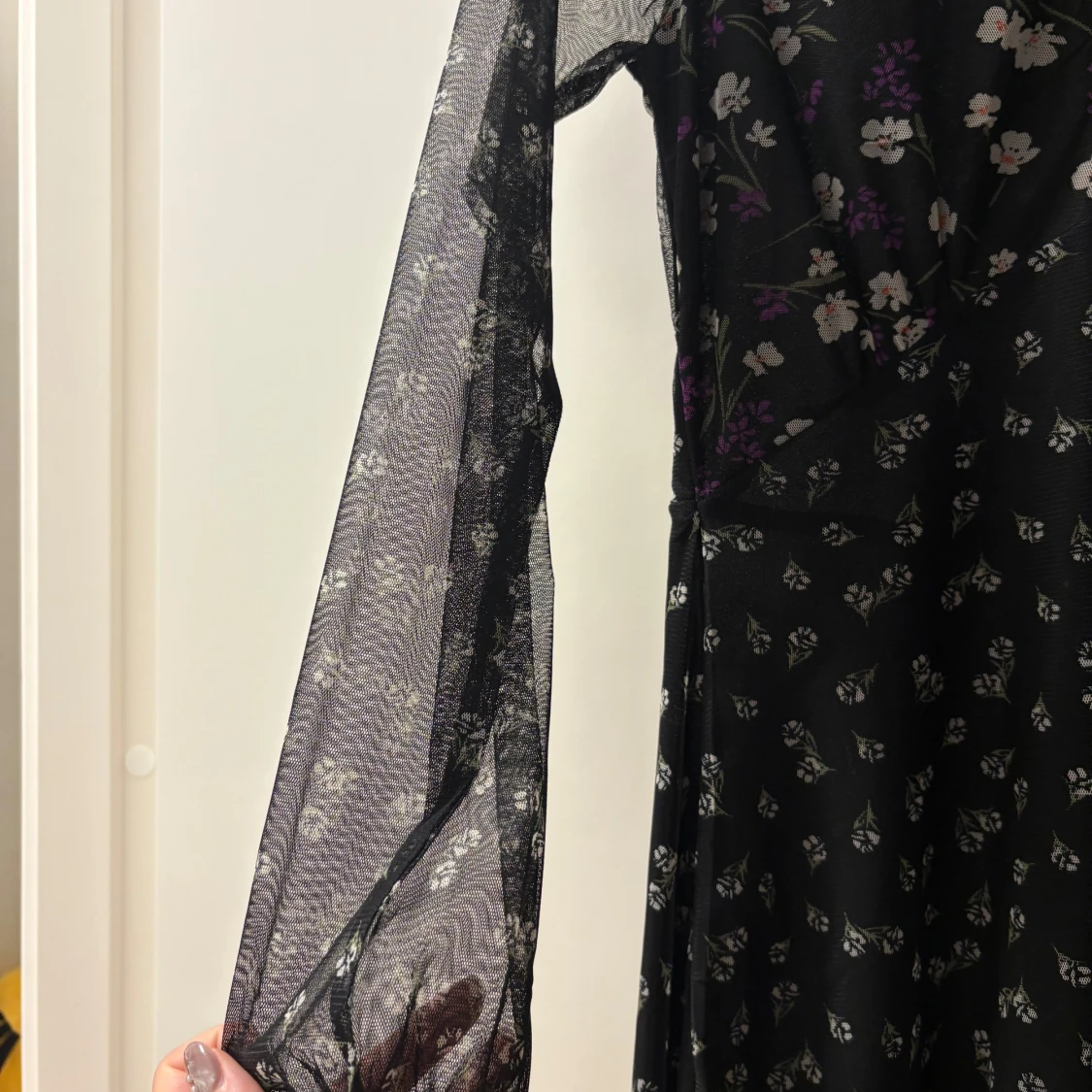 Svart kortklänning med små vita och lila blommor. Klänningen har transparenta långärmade ärmar, v-ringning och knyt framtill. Tunn mesh-liknande polyester. 100% polyester