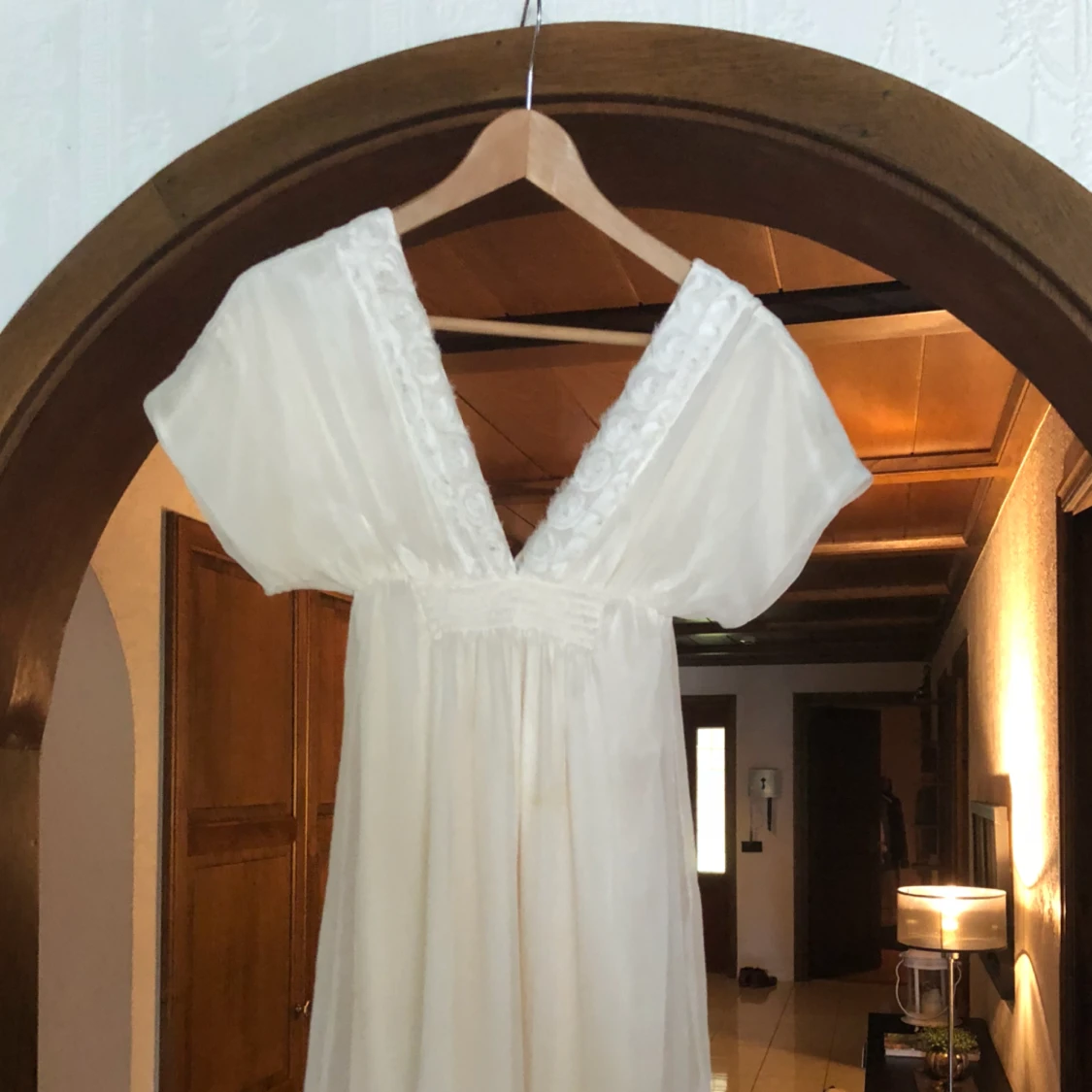 Fin, gräddvit klänning från Meteor Shower med rosor längst ner och vid byst